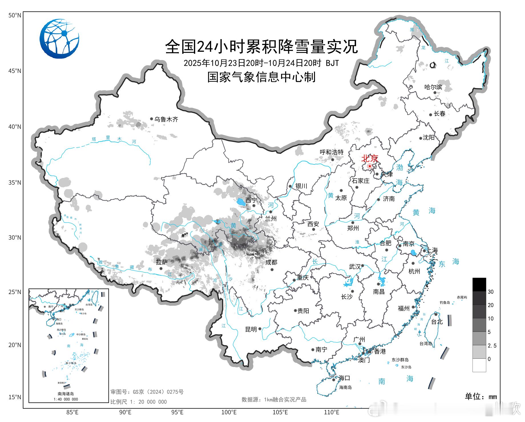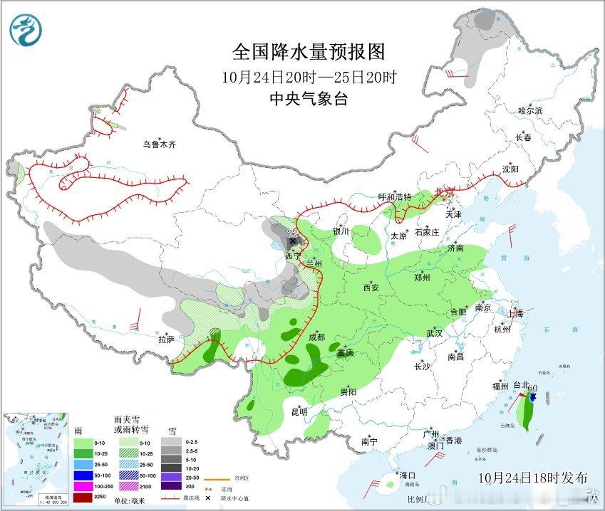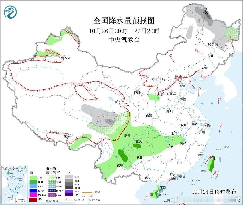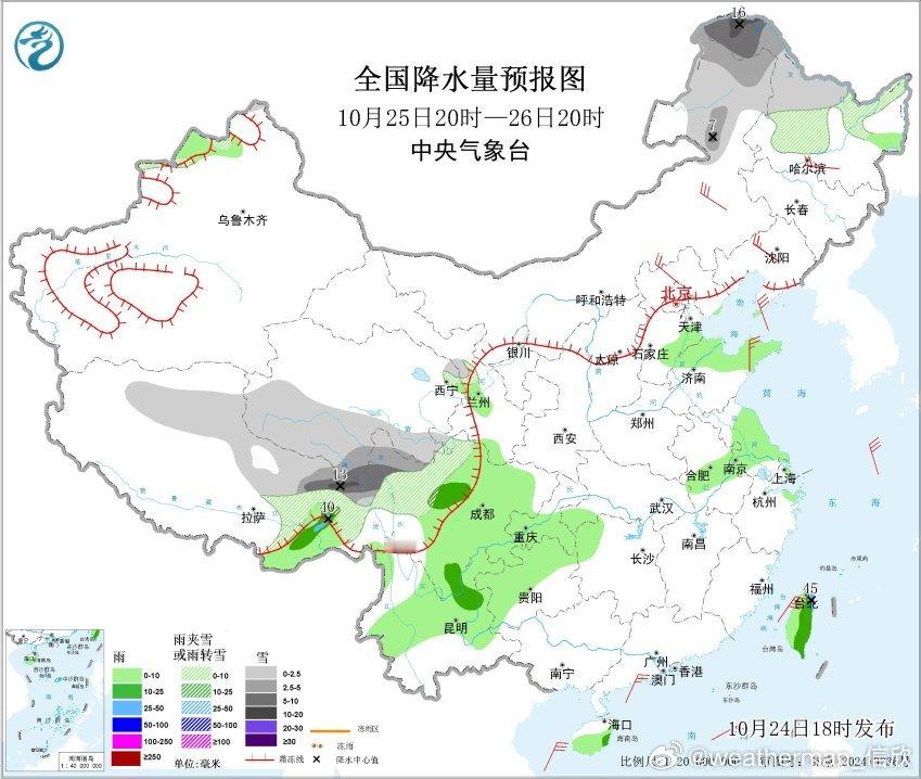 预计10月24日20时至25日20时,内蒙古东北部、黑龙江西北部、西藏北部和东部、青海东部和南部、甘肃中部和南部、川西高原北部等地部分地区有小到中雪或雨夹雪,其中,青海东部等地部分地区有大到暴雪,局地大暴雪(20~22毫米)。西藏东南部、四川中南部、重庆西部、云南东北部、台湾岛等地部分地区有中到大雨,其中,台湾岛东北部等地局地有暴雨(50~60毫米)。