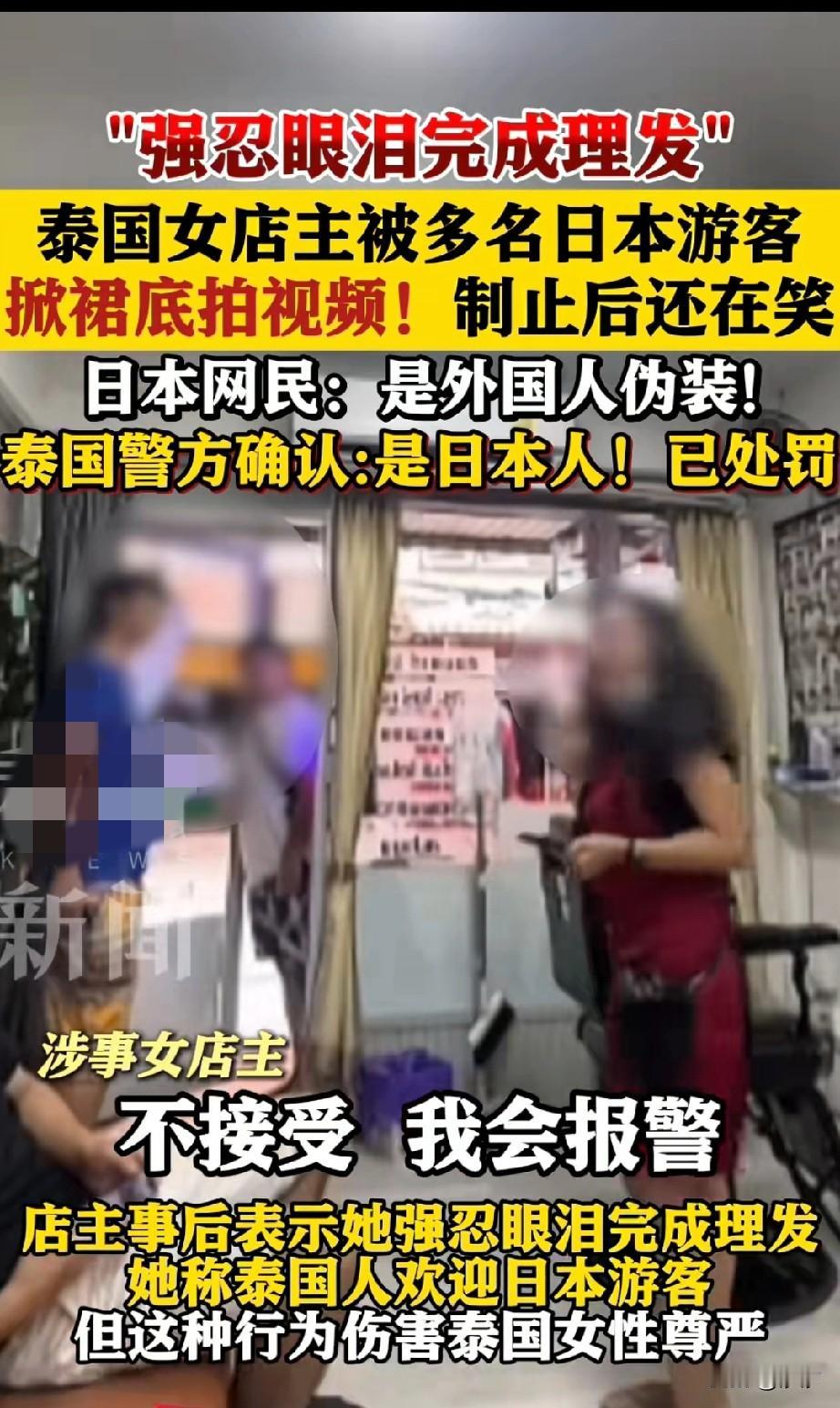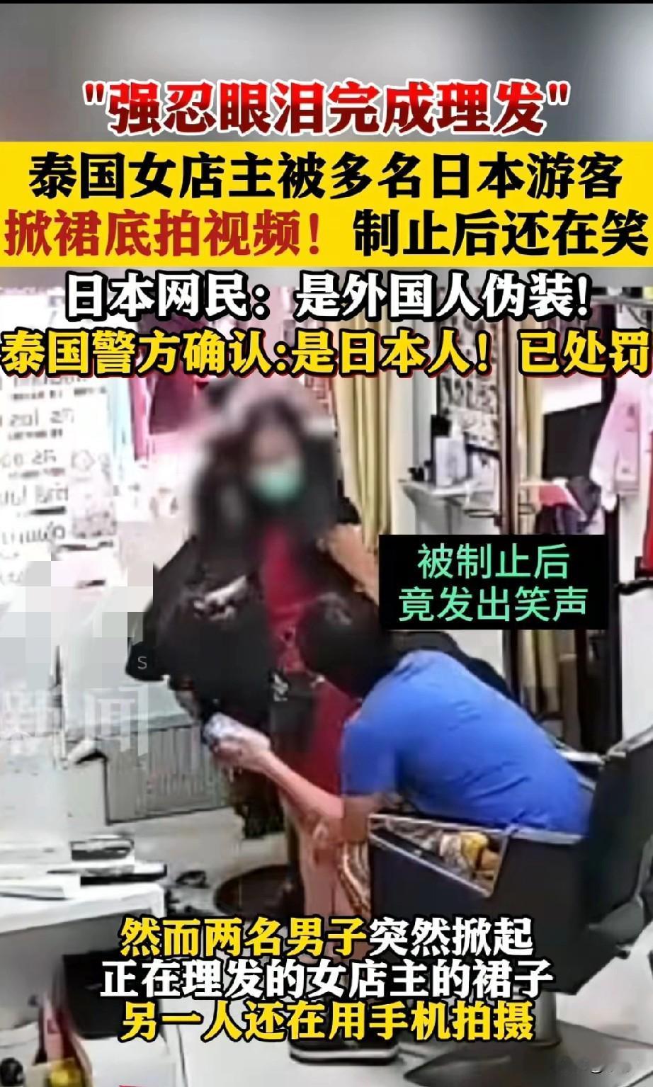 国内公知曾说过岛国人很有素质, 那这是什么?数名日本游客在泰国芭提雅“掀裙底拍”泰国美容院老板娘, 这也太过分了吧! 这可是大白天发生的事情, 被老板娘发现后大声制止, 他们居然还在放声大笑, 就差喊那句花姑娘了, 尤其是蓝色上衣大叔还拿着手机明目张胆拍摄老板娘的裙底, 不知道还以为在拍电影呢, 老板娘也是强忍着泪水完成了理发, 身体全身被气得发抖, 岛国游客就这样盯着泰国美容院34岁老板娘一直看,眼神很可怕! 为什么他们一出岛国就像变了一个人似的,泰国芭提雅也算是比较出名的旅游城市了,没想到在这里遇到这些没素质岛国游客,他们似乎反应过来, 试图劝34岁老板娘算了, 泰国老板娘表示我不接受,我要报警! 幸亏店里面有监控, 拍下了他们的犯罪行为, 随后老板娘将这段视频发布在网上, 岛国网友表示这些人是外国人伪装的, 他们认为岛国人不可能做这种事, 最后却被泰国警方打脸, 他们核实到这些就是货真价实的岛国人,大家都知道岛国人生活非常压抑, 所以他们一喝酒就本性暴露, 在大街上小解闹酒疯也是家常便饭, 有些有特殊癖好的就去东南亚国家发泄,曾经岛国外交部还发布过文件提醒他们在东南亚不要做违法的事情丢岛国人的脸! 大家对于数名岛国人明目张胆“掀裙底拍”这种行为怎么看? 日本在你心目中是什么样的 来泰国芭提雅玩什么? 日本游客 芭提雅自拍 海外游客素质