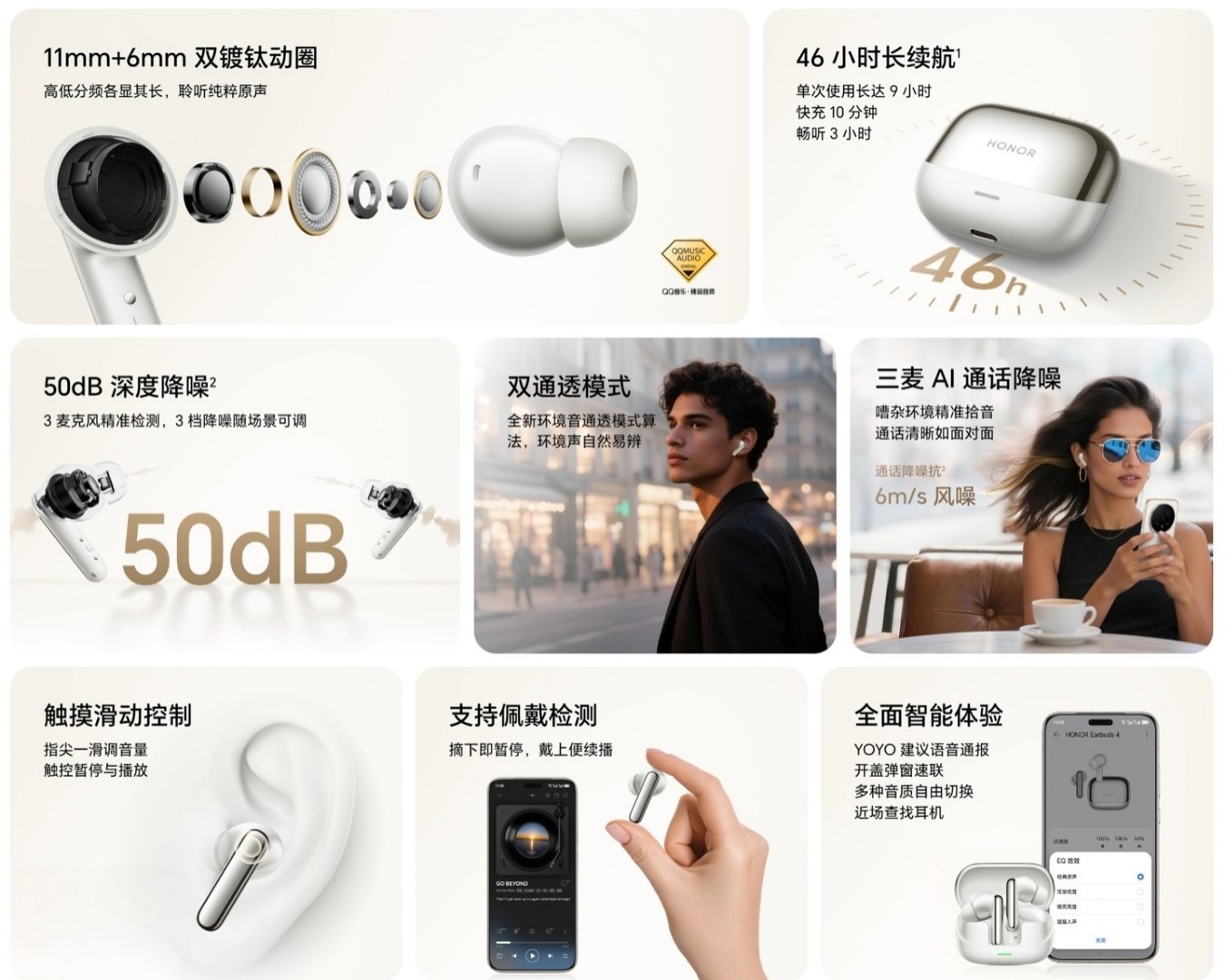 【荣耀Earbuds4降噪蓝牙耳机开售:支持50dB深度降噪,首销尊享