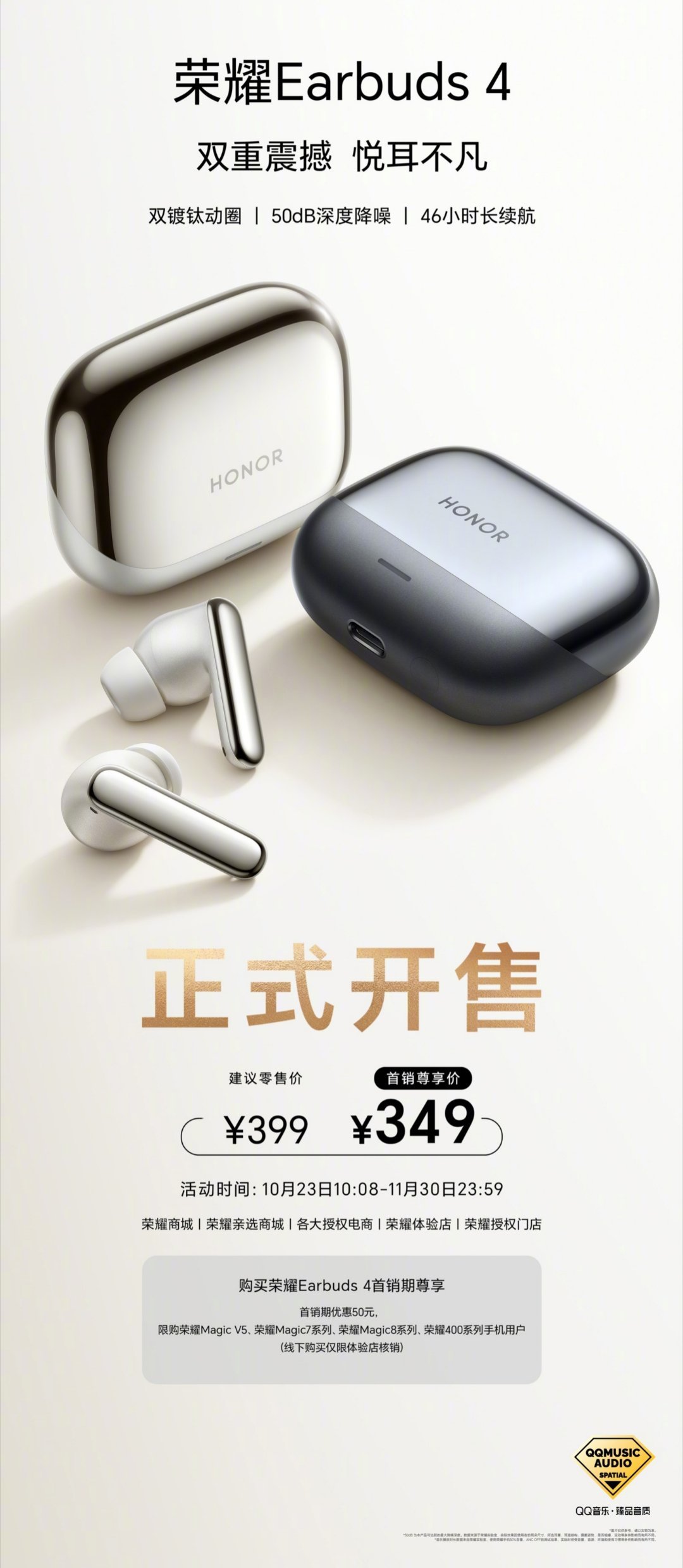 荣耀 Earbuds 4 降噪蓝牙耳机开售,首销尊享限时优惠 50 元,首销尊享价 349 元。