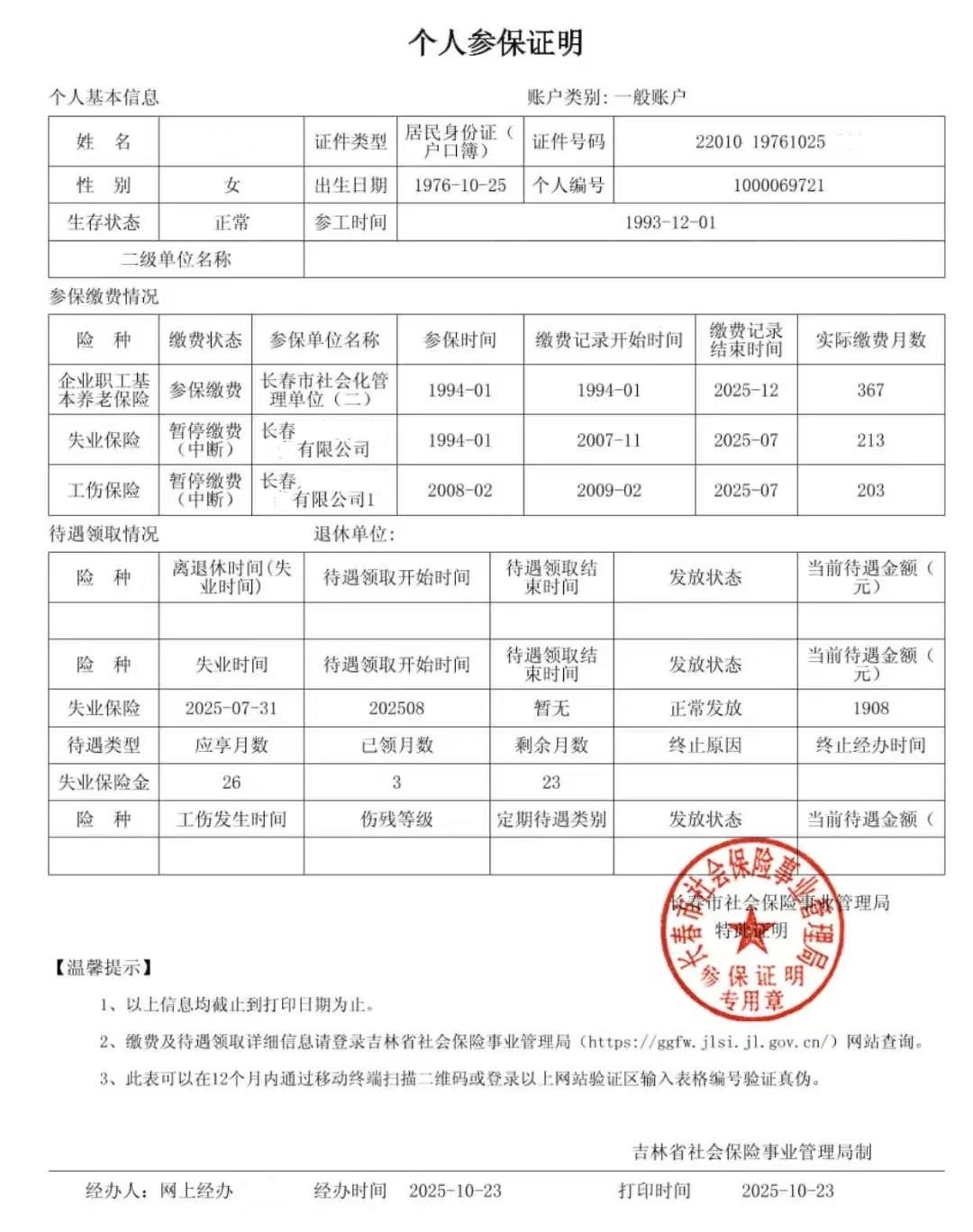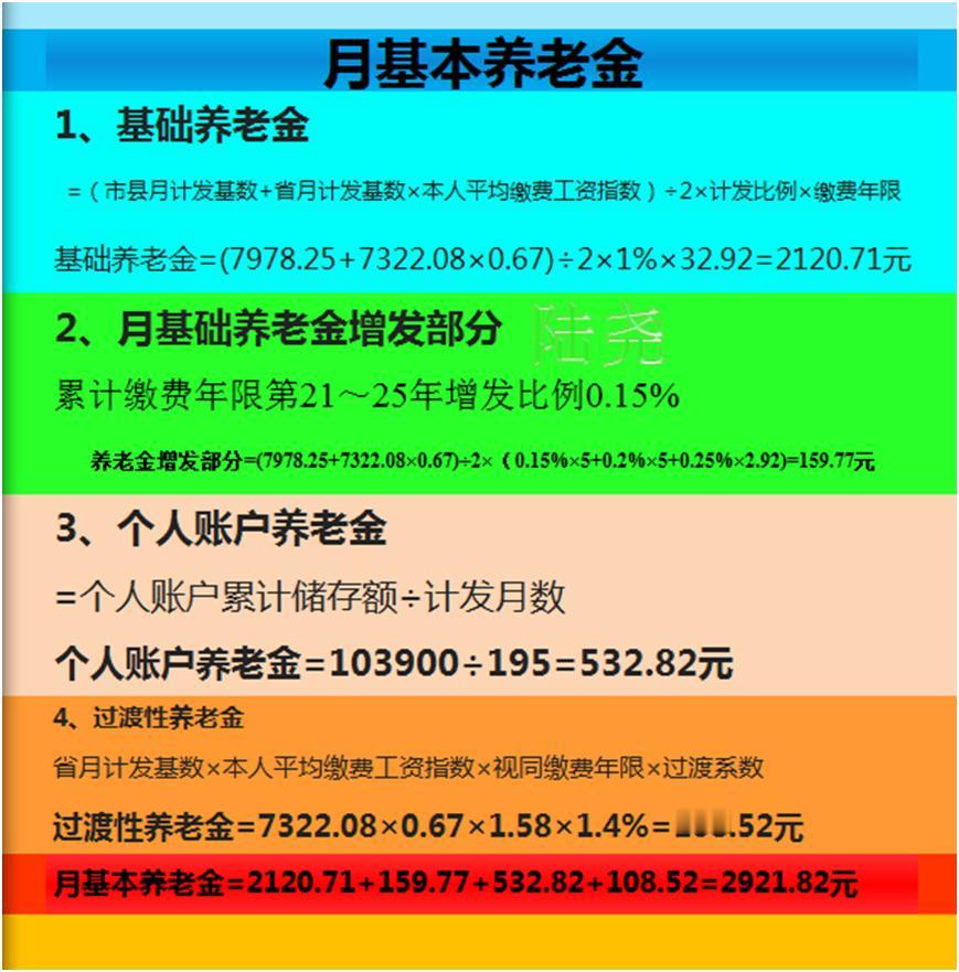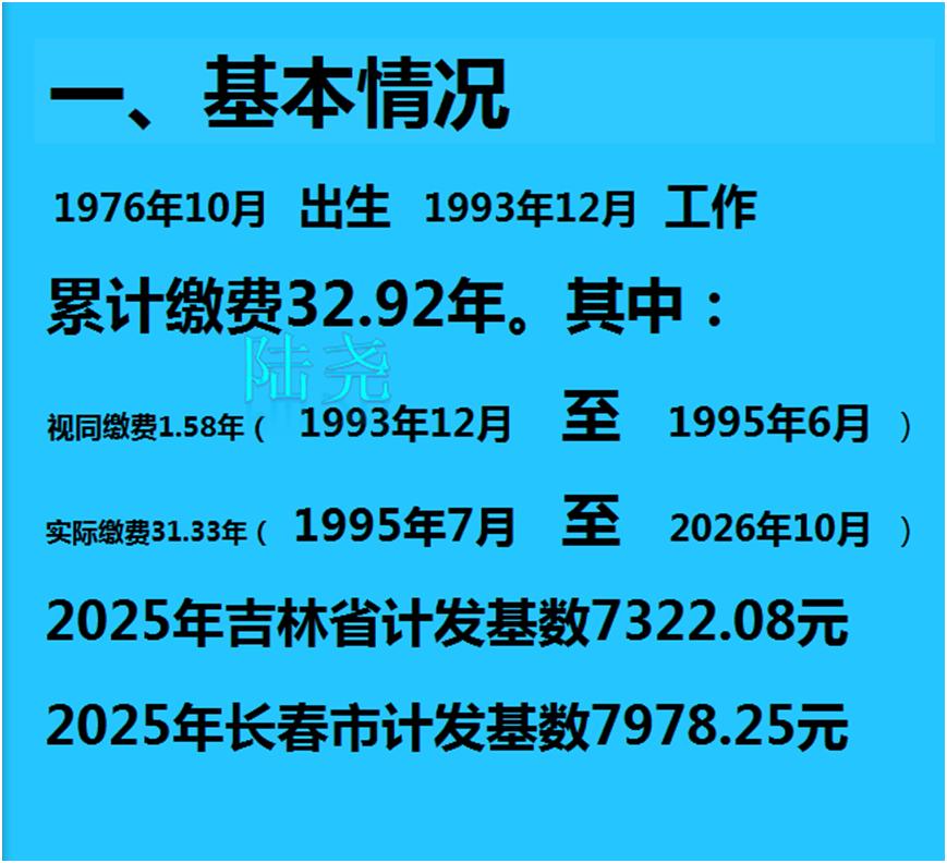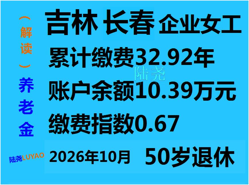 吉林长春女工领取失业金后的退休养老金变化了多少? 长春的一位朋友,2025年8年开始领取失业金。享受期为26个月。想知道延迟退休和正常退休哪个更有利? (预测)吉林长春企业女工2026年10月50岁退休养老金 累计缴费32.92年。预计退休时个人账户累计存储额10.39万元。预估平均缴费工资指数0.67。 一、基本情况 1976年10月出生,1993年12月工作。 累计缴费32.92年。其中:视同缴费1.58年(1993年12月至1995年6月)、实际缴费31.33年(1995年7月至2026年10月)。 2025年吉林省计发基数7322.08元,长春市计发基数7978.25元。 二、50岁(正常)退休月基本养老金计算 1、基础养老金 =(上一年度市县计发基数月平均工资+上一年度全省计发基数月平均工资×本人平均缴费工资指数)÷2×计发比例×缴费年限 基础养老金=(7978.25+7322.08×0.67)÷2×1%×32.92=2120.71元 2、月基础养老金增发部分 累计缴费年限第21~25年增发比例0.15%,累计缴费年限第26~30年增发比例0.2%,累计缴费年限第31年及以上部分增发比例0.25%。 养老金增发部分=(7978.25+7322.08×0.67)÷2×(0.15%×5+0.2%×5+0.25%×2.92)=159.77元 3、个人账户养老金 =个人账户累计储存额÷计发月数(50岁退休计发月数为195) 个人账户养老金=103900÷195=532.82元 4、过渡性养老金 =上一年度全省计发基数月平均工资×本人平均缴费工资指数×视同缴费年限×过渡系数(缴费年限超过20年,过渡系数为百分之一点四) 过渡性养老金=7322.08×0.67×1.58×1.4%=108.52元 月基本养老金=基本养老金2120.71+养老金增发部分159.77+个人账户养老金532.82+过渡性养老金108.52=2921.82元 预估退休养老金为2921.82元 三、延迟退休养老金计算 如选择延迟退休,自己缴纳60%档社保。延迟11个月退休至2027年9月,退休年龄为50.92岁。累计缴费达33.83年,预计退休时个人账户余额10.88万元。预估缴费指数0.67 1、基础养老金=(7978.25+7322.08×0.67)÷2×1%×33.83=2179.34元 2、月基础养老金增发部分=(7978.25+7322.08×0.67)÷2×(0.15%×5+0.2%×5+0.25%×3.83)=174.42元 3、个人账户养老金=108800÷190.8=570.23元 4、过渡性养老金=7322.08×0.67×1.58×1.4%=108.52元 延迟11个退休的月基本养老金=2179.34+174.42+570.23+108.52=3032.51元 四、延迟退休与正常退休比较 延迟退休比正常退休每月会多领取的养老金(3032.51-2921.82)=110.69元/月。 延迟退休少领取了11个月的养老金=2921.82×11=32,140.02元 延迟退休可以继续领取了失业金,领取第二年比例金额降低为1802元/月。 再领取11个月的失业总额=1802×11=19822元 延迟退休少领取养老金多领失业金差额=32,140.02-19822=12318.02元 回本期=12318.02÷110.69=111.28月=9.27年 50.92岁退休,到60.19岁就可以回本。 通过计算比较,选择延迟退休,并领取失业金是值得考虑的。