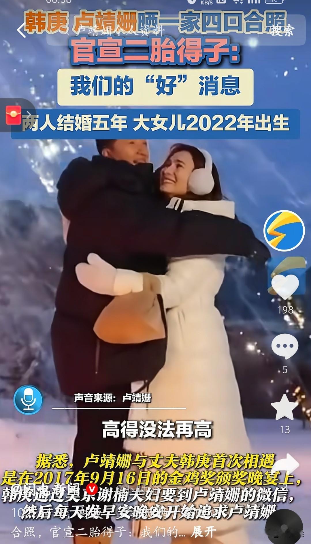 韩庚卢靖姗官宣怀二胎的消息不特别,特别是卢靖姗对韩庚的评价! 卢靖姗提起韩庚直接给“满分”,卢靖姗说她生孩子那段时间,觉得韩庚是世界上最好的老公,对韩庚的评分“高得没法再高”。 从2017年金鸡奖晚宴,韩庚通过吴京谢楠要到她微信、每天早晚安追妻,到组建家庭后处处妥帖,这份用心藏都藏不住。之前卢靖姗怀这胎到7个月时,还挺着孕肚健身,状态超能打,背后肯定少不了韩庚的细致照顾。