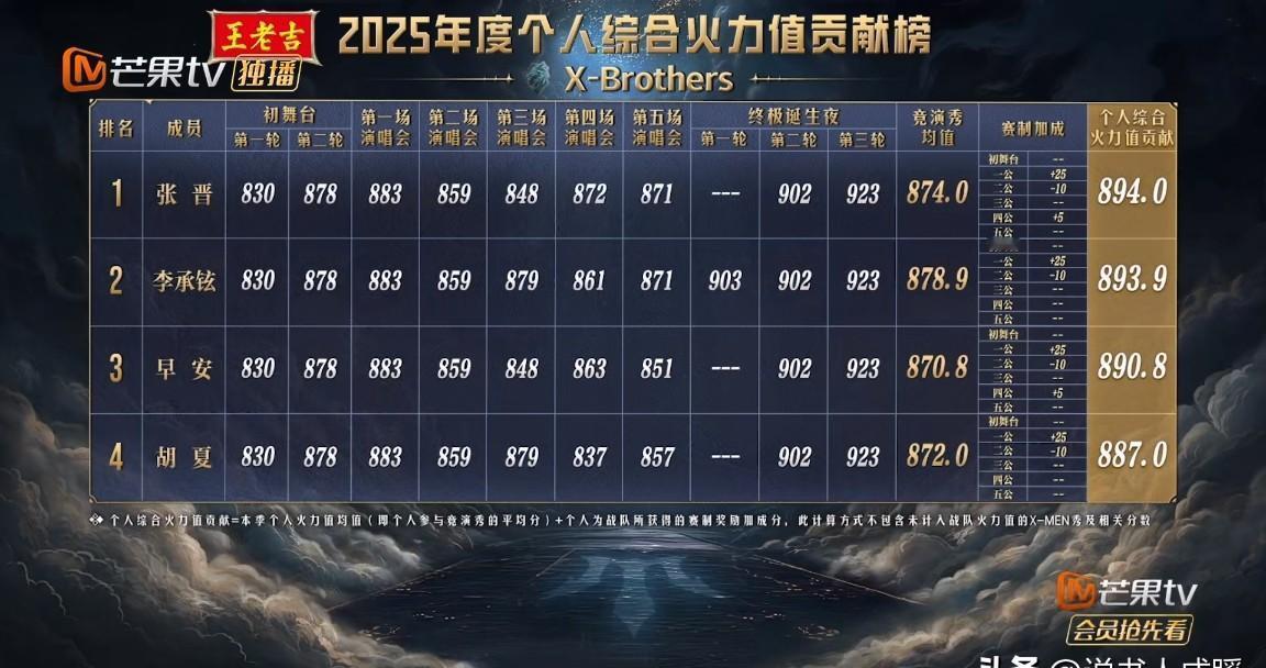 张晋和李承铉就差0.1分,火药味都快溢出屏幕了。 X-Brother战队个个火力爆表,结果团体奖一个没捞着,观众直呼“离谱”。 节目组连夜加更,把算法摊开讲:一半看现场投票,三成靠线上打榜,两成是专业评审给的分。 这规则一出,才明白为啥个人榜杀得头破血流——小数点后一位都能决定命运。 X-Brother虽然没拿团体名号,但全员直通家族演唱会黄金档,等于用实打实的舞台机会补了这口气。 说白了,节目组也懂:数据不会骗人,高热度就得给回报。 别光盯着奖杯看,真正的赢家是那些用舞台说话的人。 观众手里的票,比奖杯更真实。
