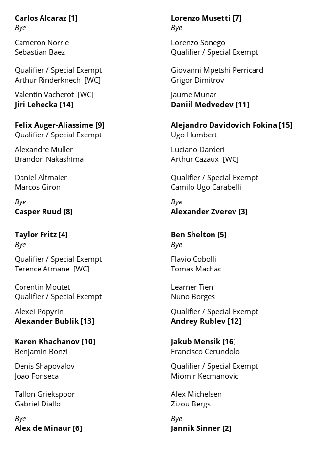 ATP1000巴黎大师赛签表出炉,表兄弟林德克内希和瓦舍罗有望次轮碰面哦!