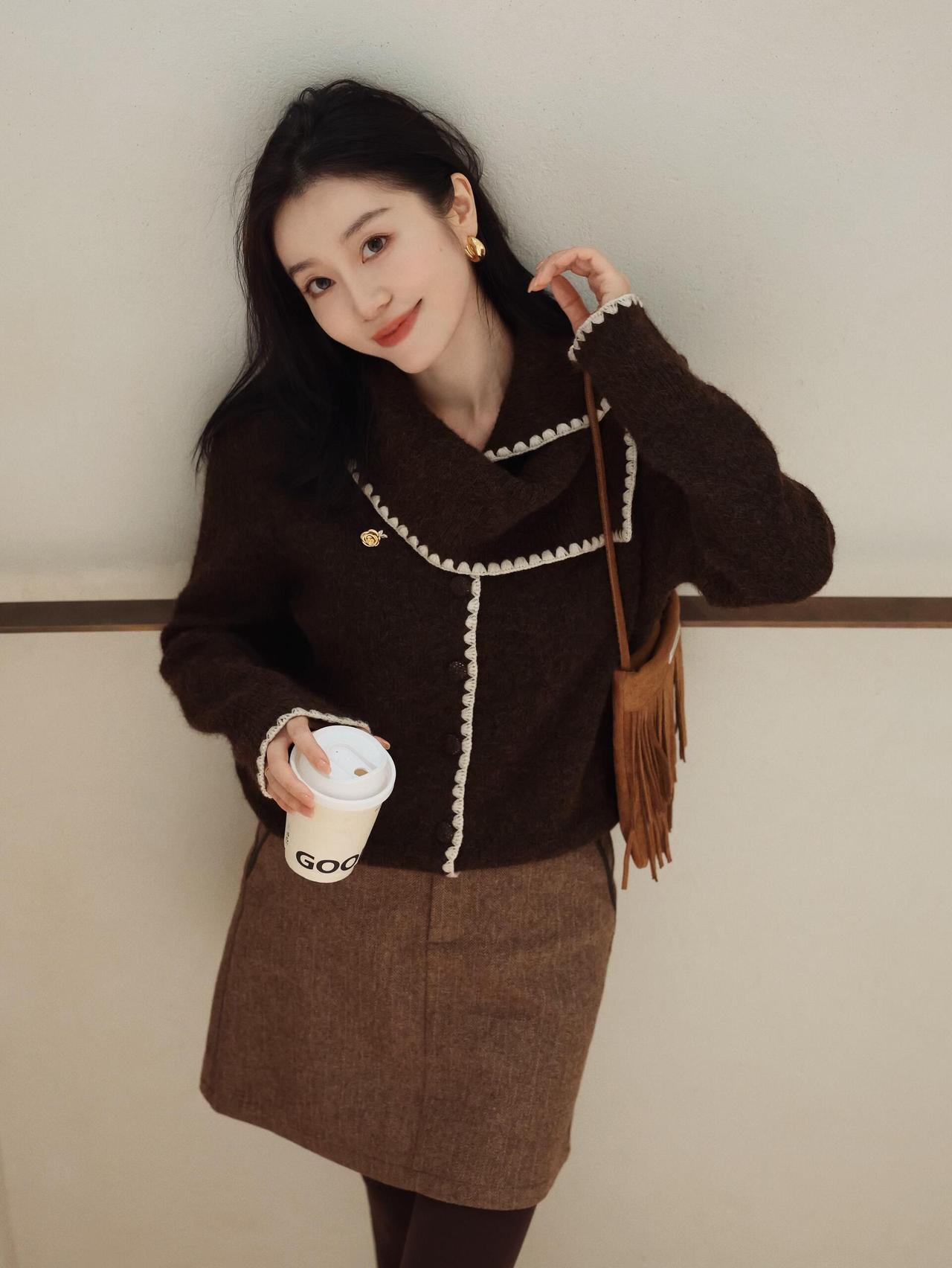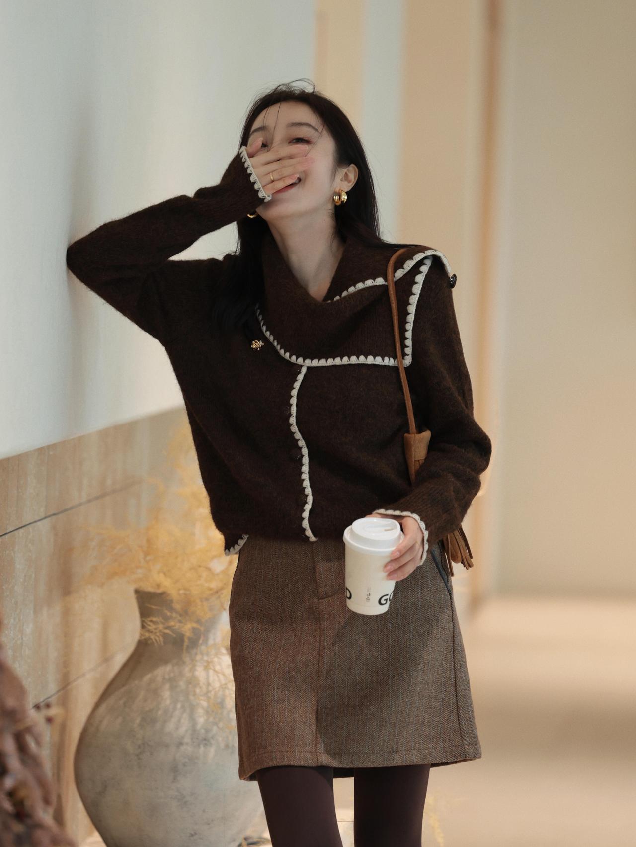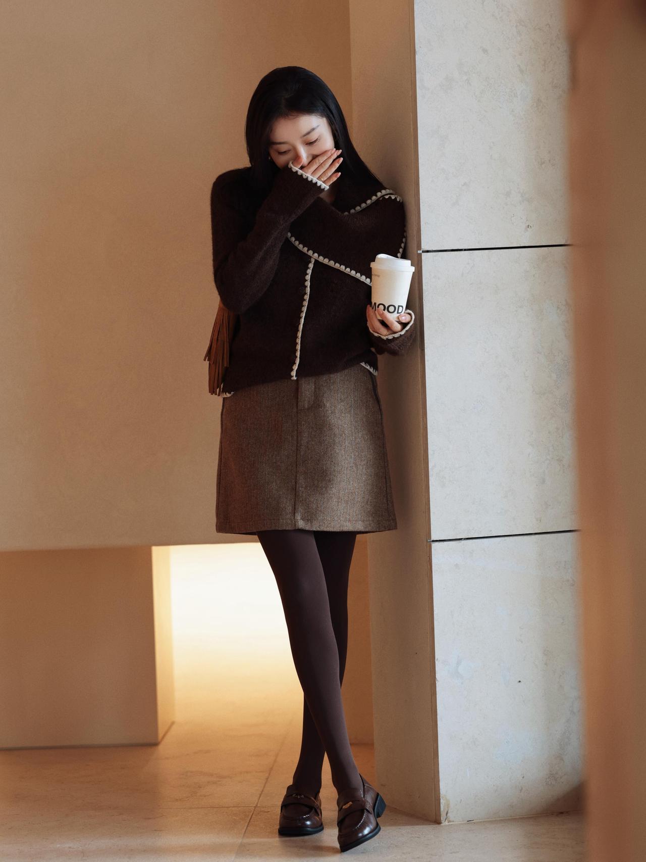 什么样的穿搭可以成为气质女神? 冬日穿搭 温暖毛衣+毛呢短裙,手捧热饮,暖心又时尚!🍂👗📸