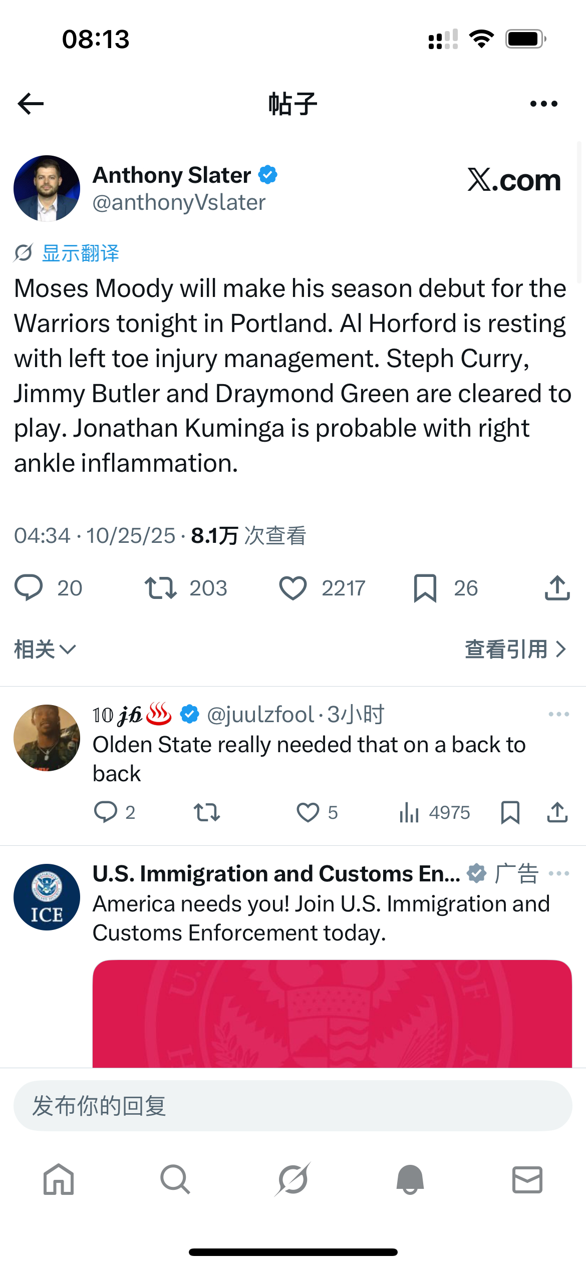 穆迪今晚将在波特兰为勇士队迎来本赛季首秀。霍福德因左脚趾伤病管理而休息。斯蒂芬·