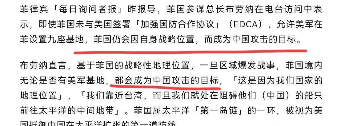 完全无视警告,菲律宾执意挑事!10月24日,菲律宾参谋总长布劳纳在访问中表示,即使菲律宾未与美国签署加强国防合作协议,允许美军在菲设置九座基地,菲律宾仍会因自身战略位置,而成为中国攻击的目标。这是因为我们国家的地理位置,我们靠近台湾,而且我们就处在阻碍他们(中国)的船只前往太平洋的中间地带。 菲律宾属于菲国属太平洋第一岛链的一环,被视为美国抵御中国在太平洋扩张的第一道防线。很显然,我们多次警告菲律宾,要求菲律宾不要允许美国在境内部署导弹系统,但是菲律宾对此完全是置之不理。菲律宾不仅不听警告,反而以距离台湾太近为由,菲律宾会成为我们军事打击的目标,认为菲律宾有部署的理由。 说实话,这样的说辞,既是挑衅,更是讨打。台湾问题是我们的内政,菲律宾在台湾问题上严正立场,严格遵守一个中国原则,菲律宾怎么会成为我们攻击的目标。中美博弈,台湾是主要角力点,聪明的国家都会想着办法躲避威胁,还没见过像菲律宾这种主动往上面靠的。 所谓的距离近,就会成为攻击目的,这样的逻辑完全是胡说八道。事实上,菲律宾被攻击只有一种可能,那就是当武统发生时,菲律宾将其军事基地给美国使用,以军事介入我们解决台湾问题。很显然,如果菲律宾真的看不清局势,上蹿下跳,那我们绝对不会客气。