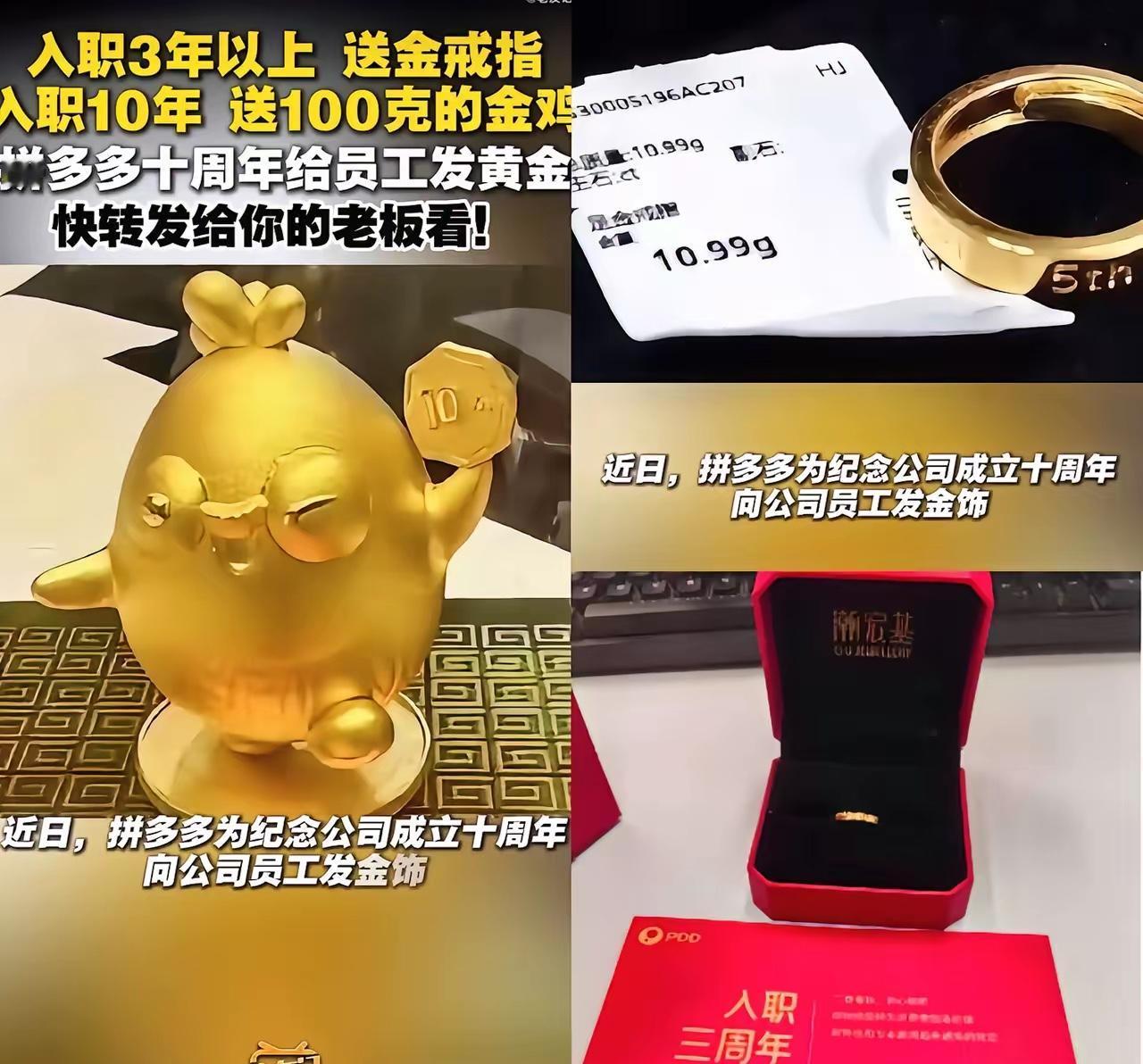 拼多多给老员工发金条直接炸场! 十年老伙计领一百克金疙瘩,五年三年也能揣上金戒指回家。这波操作把职场忠诚度整成硬通货,同行老板们看得肝儿颤。大伙儿都琢磨自家公司啥时候能跟上。