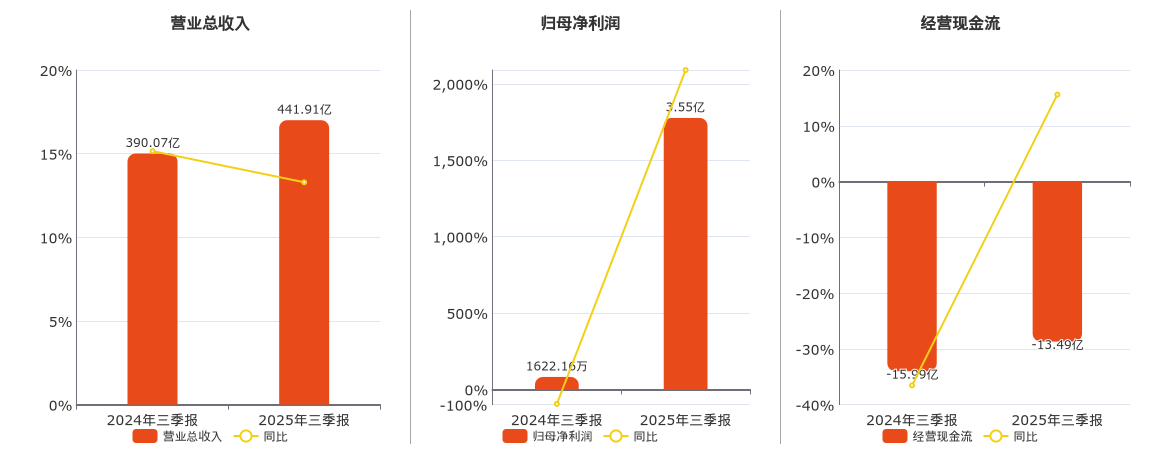 公司营业总收入为441.91亿元。归母净利润为3.55亿元。经营活动现金净流入为-13.49亿元。