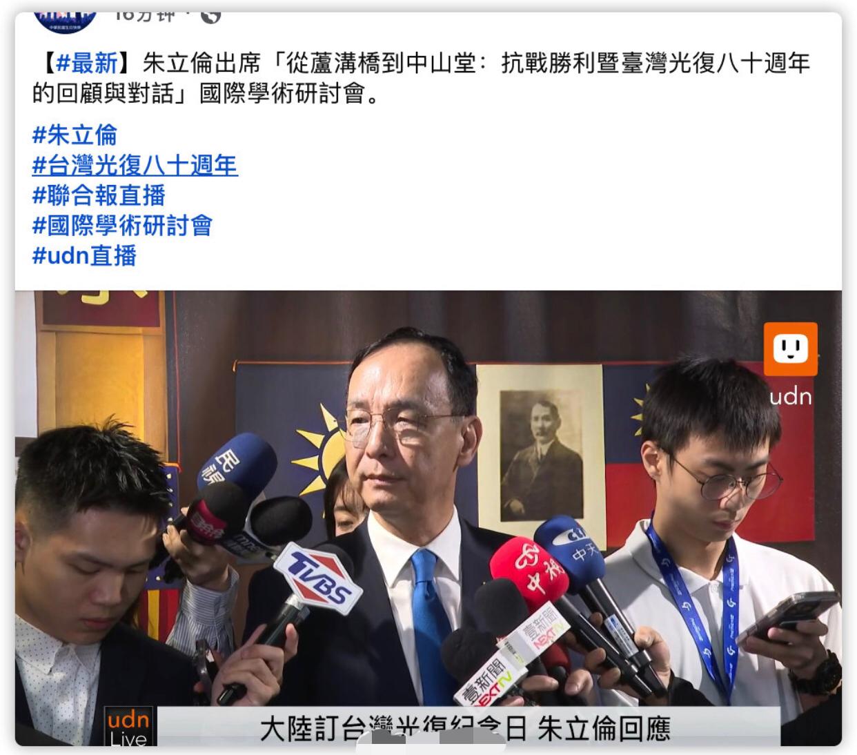 台媒:大陆设立台湾光复纪念日,国民党前主席朱立伦不爽有话说了,说不尊重台湾,应该让台湾自己来设立纪念日。