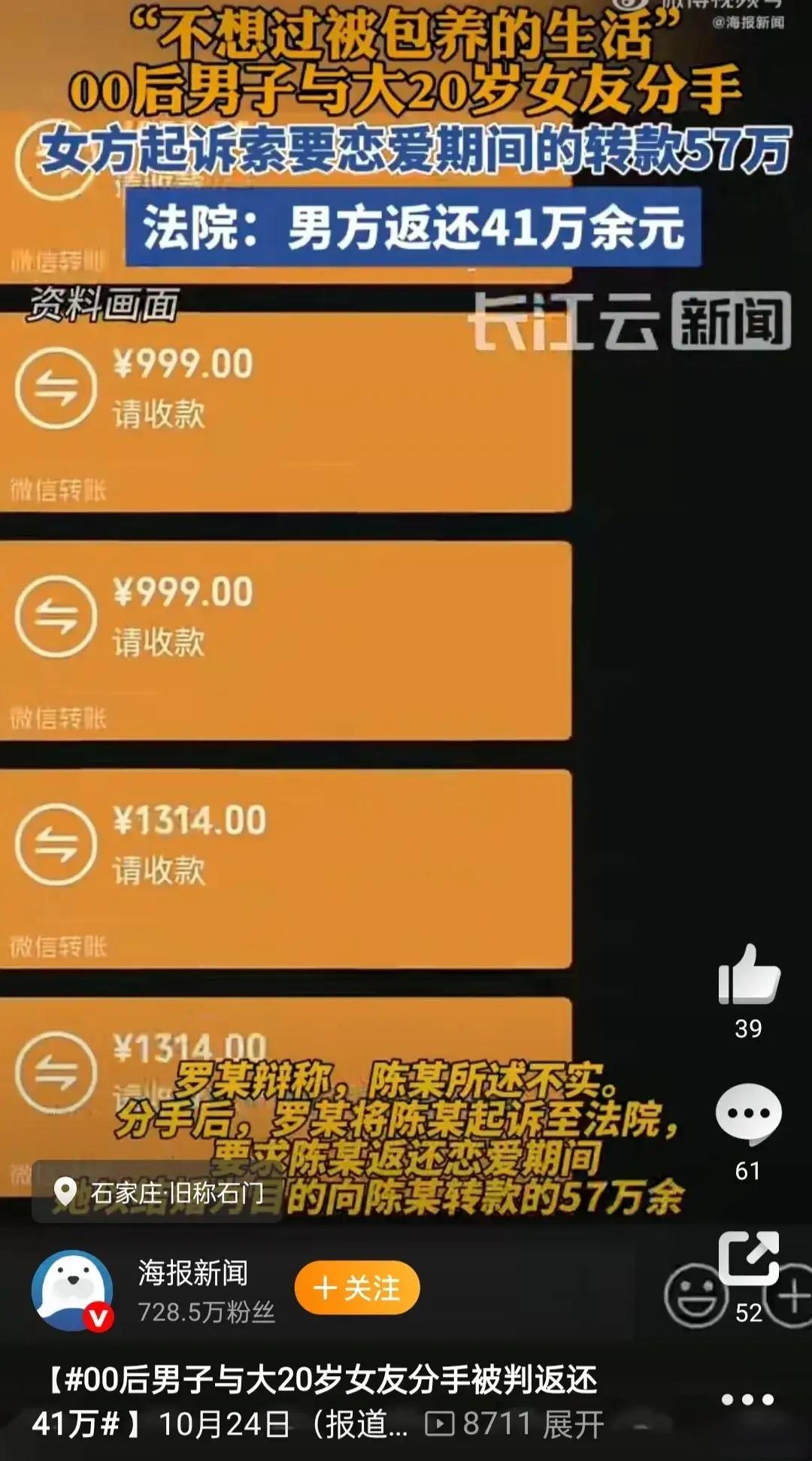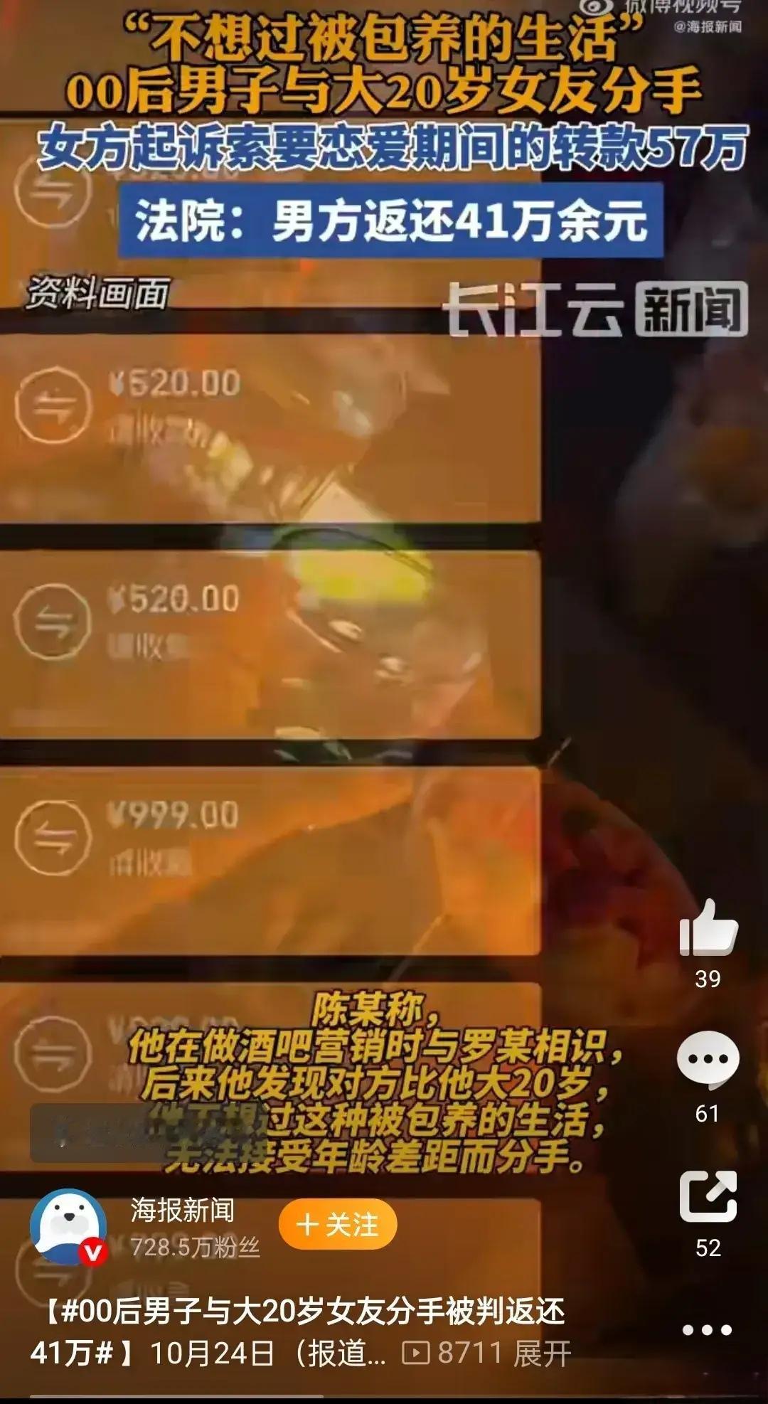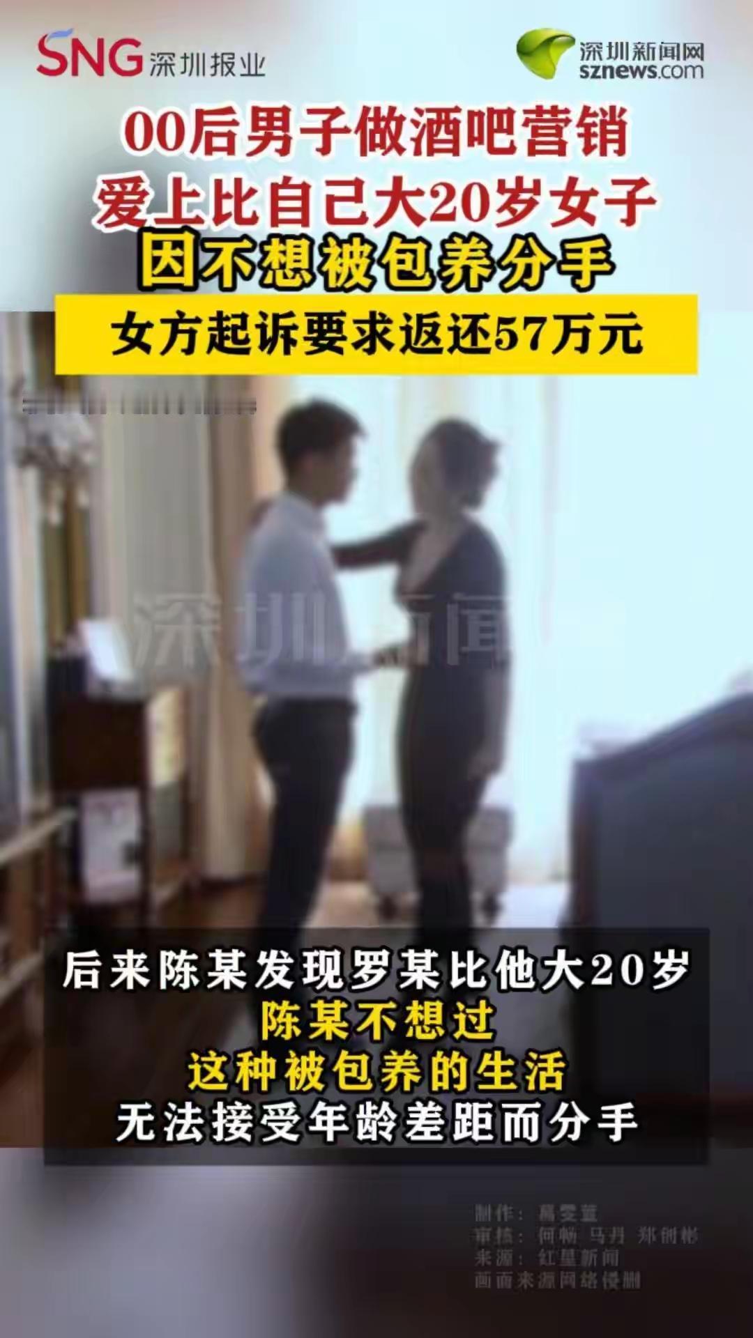 男子不想被包养提分手,女子怒起诉还钱,法院判了… 吃了后发现老嫌弃想抹嘴就溜?不行,得还钱! 2020年8月,00后陈某在三亚在酒吧做营销,罗某作消费者经常去陈某工作的酒吧消费,久而久之两个人相识后,陈某发现罗某消费观念超前,而且大方。而且罗某经常转账给陈某让他帮忙安排酒水招待罗某的朋友。同时发现罗某还是个单身女人,身材样貌也不错,于是就对罗某展开追求。 很快两个人便相处了在一起,陈某也辞去酒吧的工作随罗某一起去上海生活,到了上海生活了一段时间后,彼此也相安无事,因为罗某条件好,也没有让陈某再出去工作,每天就是陪着罗某到处游山玩水,吃喝玩乐。 这样的日子彼此都感到舒适惬意,直到2021年3月,一个意外的发现让陈某有了一种不适应的感觉,那就是他发现罗某竟然是80后,整整比陈某大20多岁! 如是,陈某认为这不是对等年龄之间的谈恋爱,而是一种被“包养”的生活。在经过几个月内心的挣扎和纠结后,陈某终于在2021年11月份以无法接受巨大的年龄差距、被包养以及罗某经常要求和陈某生孩子的事向罗某提出分手。 罗某当然不愿意,因为在和陈某相处在一起的这一年多时间里,罗某在陈某的身上除了花费了不少时间还有大量的金,罗某粗粗的算了一下,不仅逢年过节给陈某发红包,在特殊意义的日子比如520、1314等日子也是转大额特殊的红包给陈某表示爱意。而且自从和陈某在一起,陈某不再工作,陈某的衣食住行小到连内裤都是罗某买的,一年多点时间总共在陈某身上花了将近80多万。 看到陈某如此无情绝决,罗某一怒之下就一纸诉状把陈某诉到法院要求陈某还钱57万! 经过一审调查后,判陈某还47万,陈某不服上诉,二审核实认为520、1314属特定意义红包属情侣间的赠与,不支持,扣除这些外,陈某需返还41万! 这回陈某该傻眼了,他认为本是一场男女之间的普通恋爱,不合适分手就是了,没想到如今还牵涉到那么多金钱纠纷,虽然自己和罗某在一起一年多没工作收入,但陪伴罗某自己也是付出时间和精力的,难道这些与罗某给予金钱补偿不对吗?而且,罗某虽然给自己转账了不少钱,但有些开销也是两个人一起的啊! 真想说一句,得了便宜还卖乖!自己当初那点心思明眼里一看就知道。贪图享乐,不想努力,借以谈恋爱的名义结识相处后,想要的是什么还用说?如果真是嫌弃年龄大不可能在一起一年多了不会发现! 陈某年纪轻轻不务正业,以恋爱之名得来的钱财且数额大本就超出了正常的恋爱之间的关系付出,判返还是应该且支持的,这种不良风气和影响到公序良俗的行为必须打击制止!