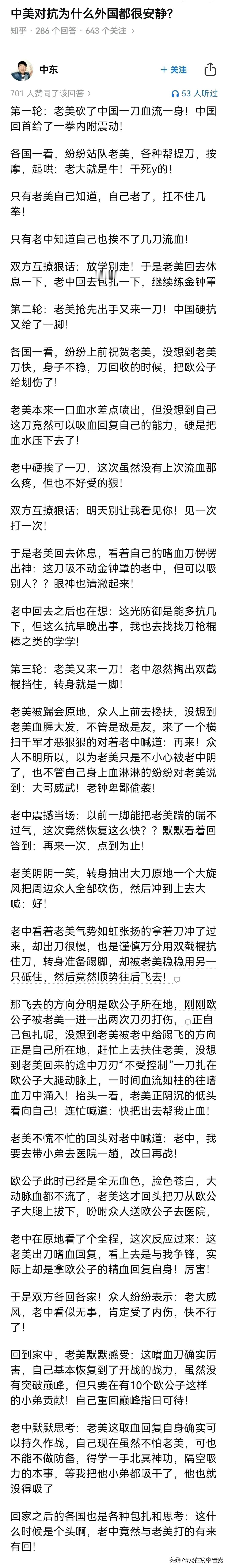 卢克文转发的一个网友对“中美对抗为什么外国都很安静”这个问题的回答。 读起来很像一个短篇武侠小说,而且很容易被其复杂的叙事给绕晕。但是当你静下来将文章读完,你肯定会发出这样的感叹:原来是这么回事,写得太精彩了! 如果你觉得写得太复杂,不想看,也可以看经其他网友“翻译”过的内容: 两只老虎打架,引来一群猴子在旁边观望。俩老虎打了一天之后都累了,于是约好明天再战,晚上它们不约而同地抓猴子来吃以补充体力。第二天再战,俩老虎打得难解难分,都受了伤,休战前都在想今天晚上吃什么补血。其中一只提议有一群又肥又软弱的欧鸡很好吃,晚上两只老虎转而猛吸欧鸡的血。 看到欧鸡的下场,其他旁观的动物们全都不敢出声了,都怕自己会成为两只老虎的下一个目标。