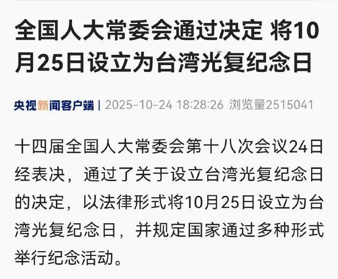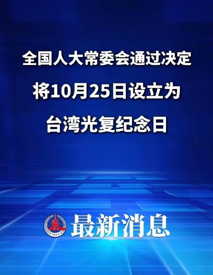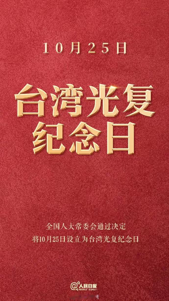 10月25日,为台湾光复纪念日!今年正式通过最高权力机关背书确认!这是对历史的尊重,对客观事实的再次认定! 背负《马关条约》的耻辱,台民拼死抵抗倭奴的统治50载,至1945年10月25日光复,回归祖国怀抱!这是铁一般的事实。 光复80载矣,竟有逆贼数典忘祖,认贼作父,自认倭种、白皮奴! 恬不知耻也! 既已光复,期待解放!
