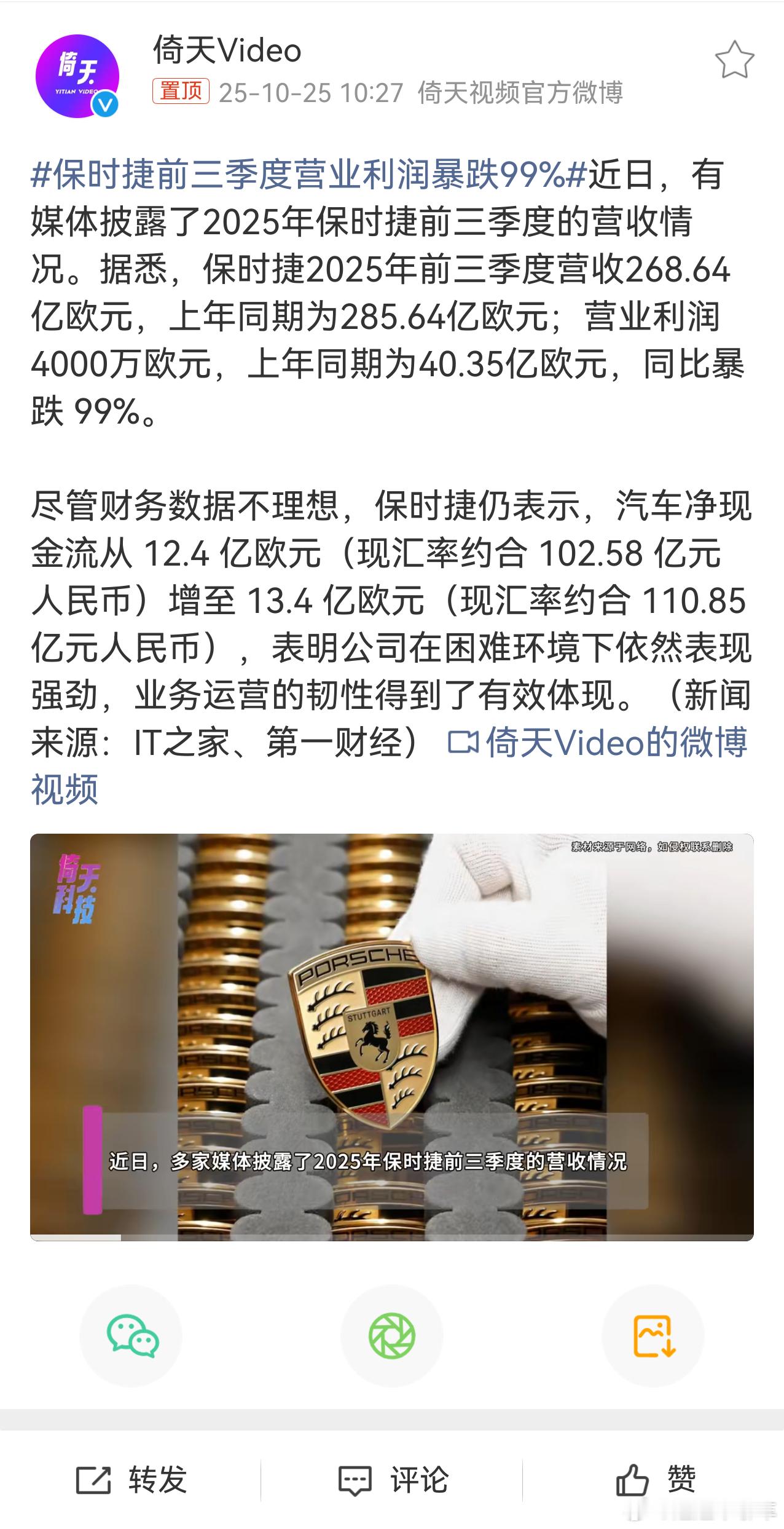 保时捷前三季度营业利润暴跌99%看了看营收差了才6%,也没有很离谱,但是利润竟然