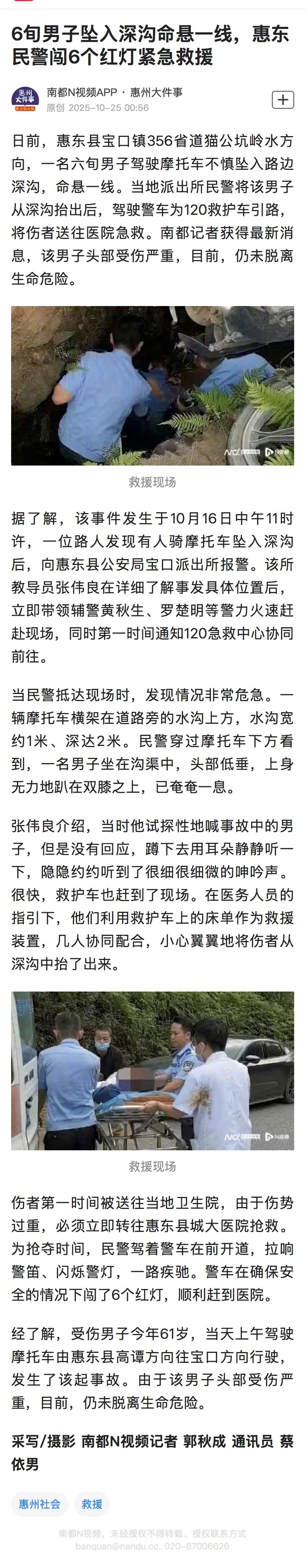 #惠州民警为救人连闯6个红灯#【#男子坠沟命悬一线民警医护火速救援#】六旬男子骑摩托坠入惠东两米深沟,命悬一线!民警火速赶到,联合医护人员将其救出。为抢黄金救治时间,警车拉响警笛为救护车开道,连闯6个红灯将伤者送医。目前伤者头部重伤,仍未脱离生命危险。为争分夺秒的救援点赞! ​​​