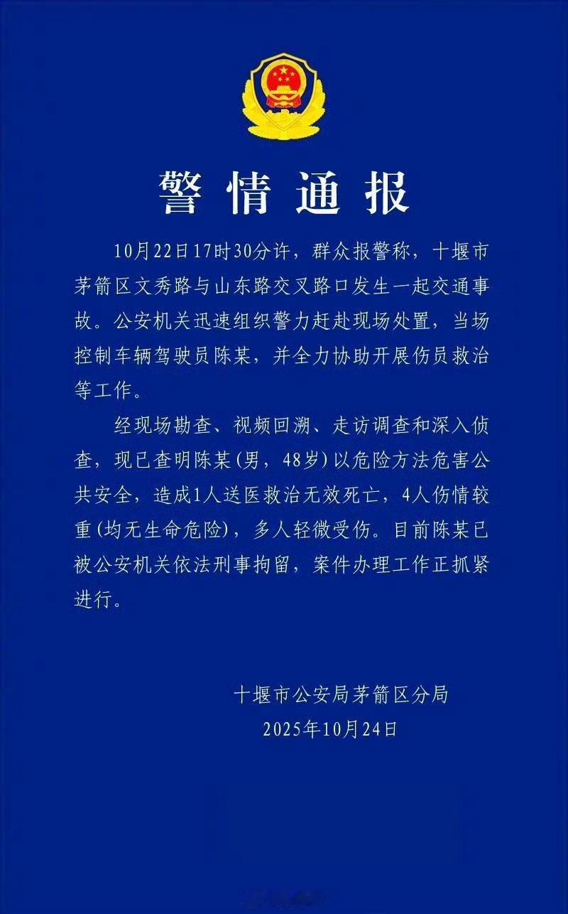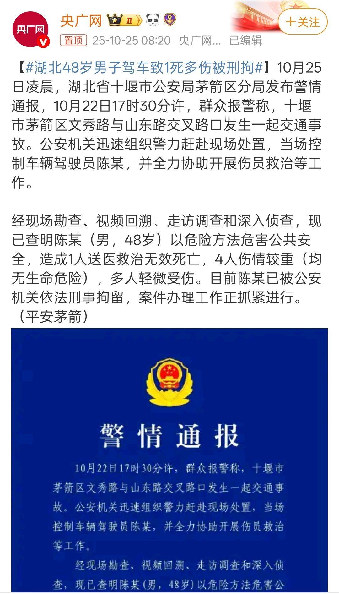 官方通告来了!湖北48岁男子驾车致1死多伤被刑拘该男子已被刑拘。前几天网上疯传...不信谣,不传谣。以官方最终结果为准!