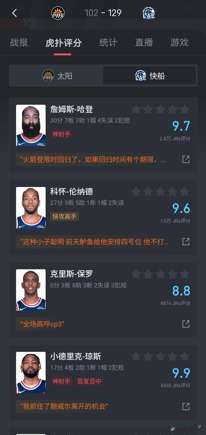 快船获胜,以大比分击败太阳。这并非得益于主教练战术体系的合理,而是仰仗哈登的极致发挥、小琼斯的百发百中,还有伦纳德的锦上添花。说白了,靠的还是球星的个人能力。至于卢指导的战术,全场看下来,压根没看出来。 不得不说,卢指导拿着高薪,却毫无临场指挥能力。在比赛焦灼阶段,他无法洞察场上局势。说得难听点,但凡哈登、小卡和小琼斯中有一人发挥不佳,对阵太阳这场比赛能不能赢都成问题。不过幸好赢了,赢了便胜过一切! 恭喜快船喜提赛季首胜!