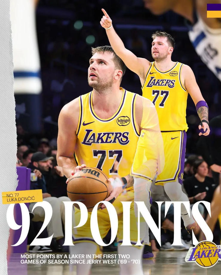NBA常规赛湖人主场对阵森林狼的比赛已经结束。全场战罢,湖人以128-110战胜森林狼。 赛后,湖人前锋八村垒接受了采访。 谈到东契奇赛季前两场已经轰下92分,八村赞美道:“他让这一切看起来很轻松。” 八村表示,他在第一节看比分牌时,就看到卢卡拿到17分,“他太厉害了!” 本场比赛,湖人球员卢卡-东契奇出战34分钟,23投14中,其中三分球12投5中,罚球19投16中,得到49分11篮板8助攻。