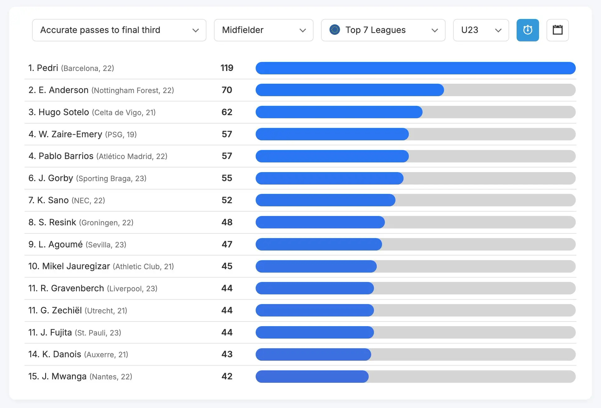 欧洲七大联赛U23中场球员向前场准确传球榜: