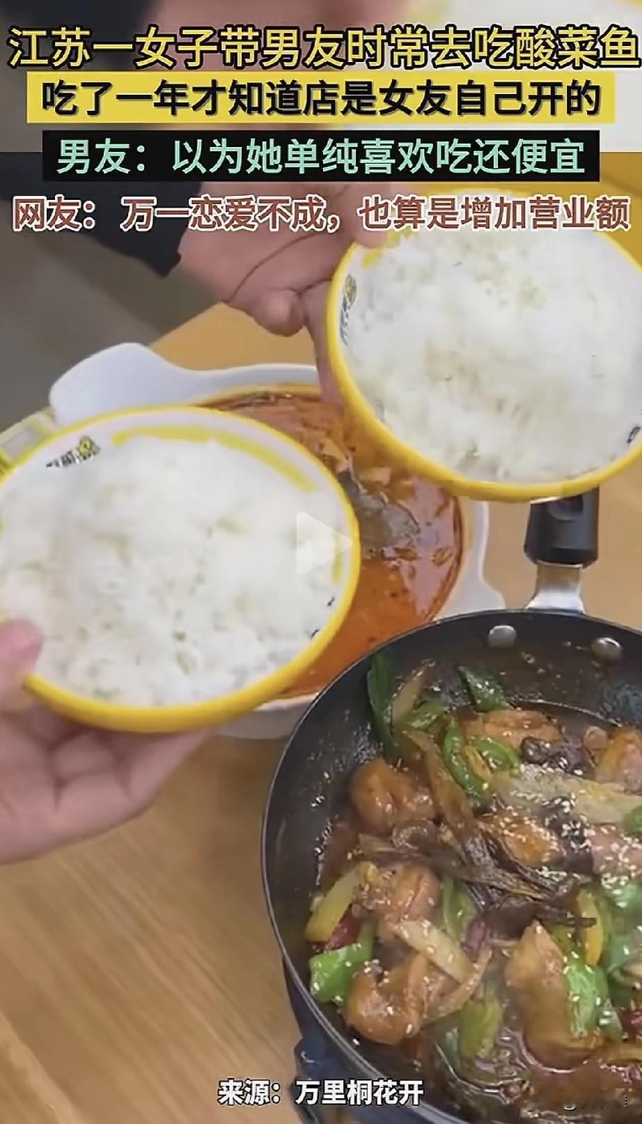 “套路有点深啊!”男子与女子恋爱,期间女友总喜欢去吃一家酸菜鱼,其它家的不吃,男友以为女友只是单纯的喜欢吃这家,随着交往的时间越来越长,了解的越来越深入,男子才发现原来这家酸菜鱼店是女友开的。网友给男子支招:“ 兄弟我不是个挑事的人,兄弟你拿他当女友,他拿你当顾客,你可得当心了!”