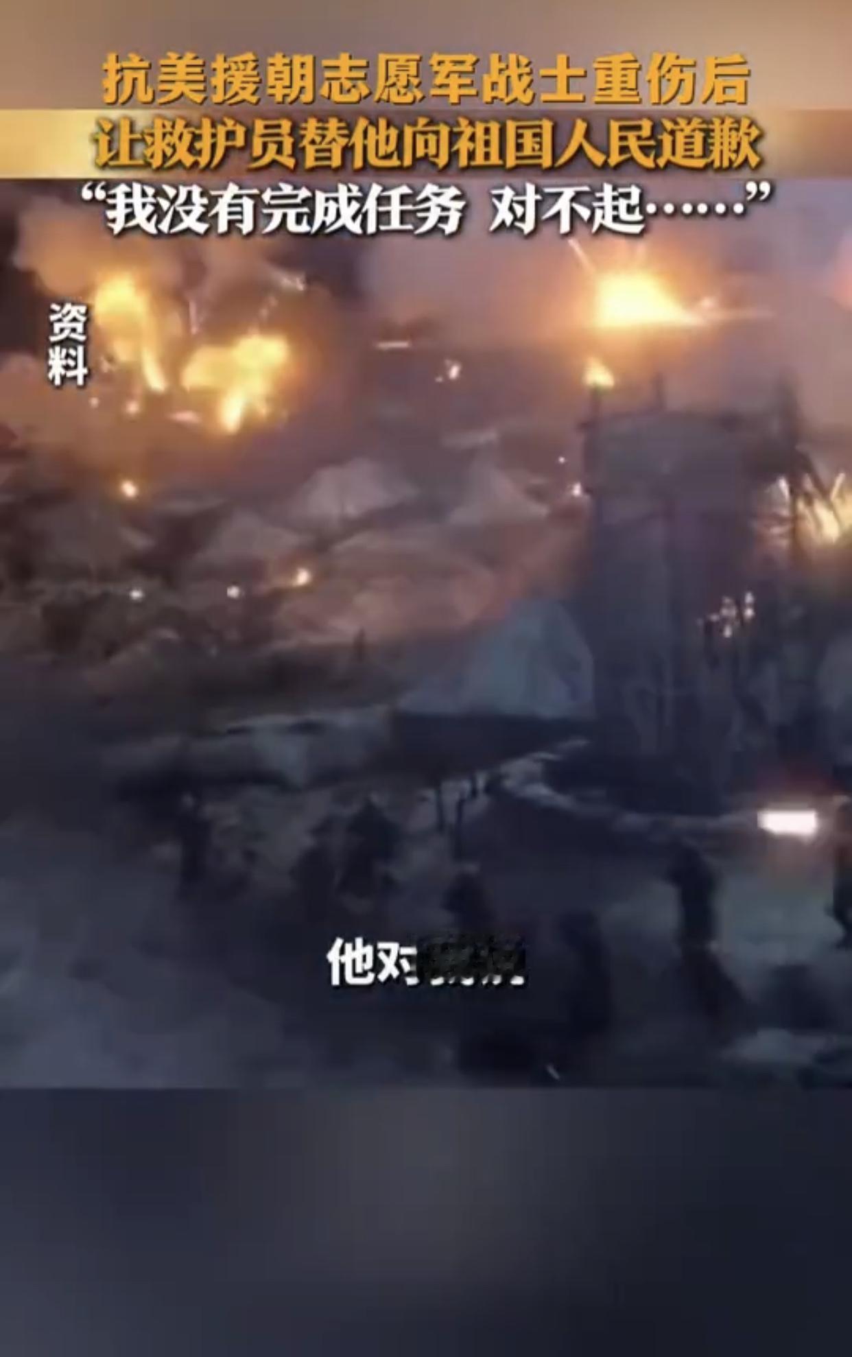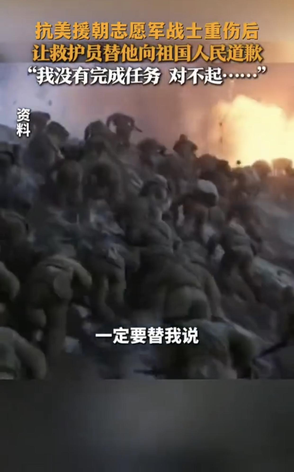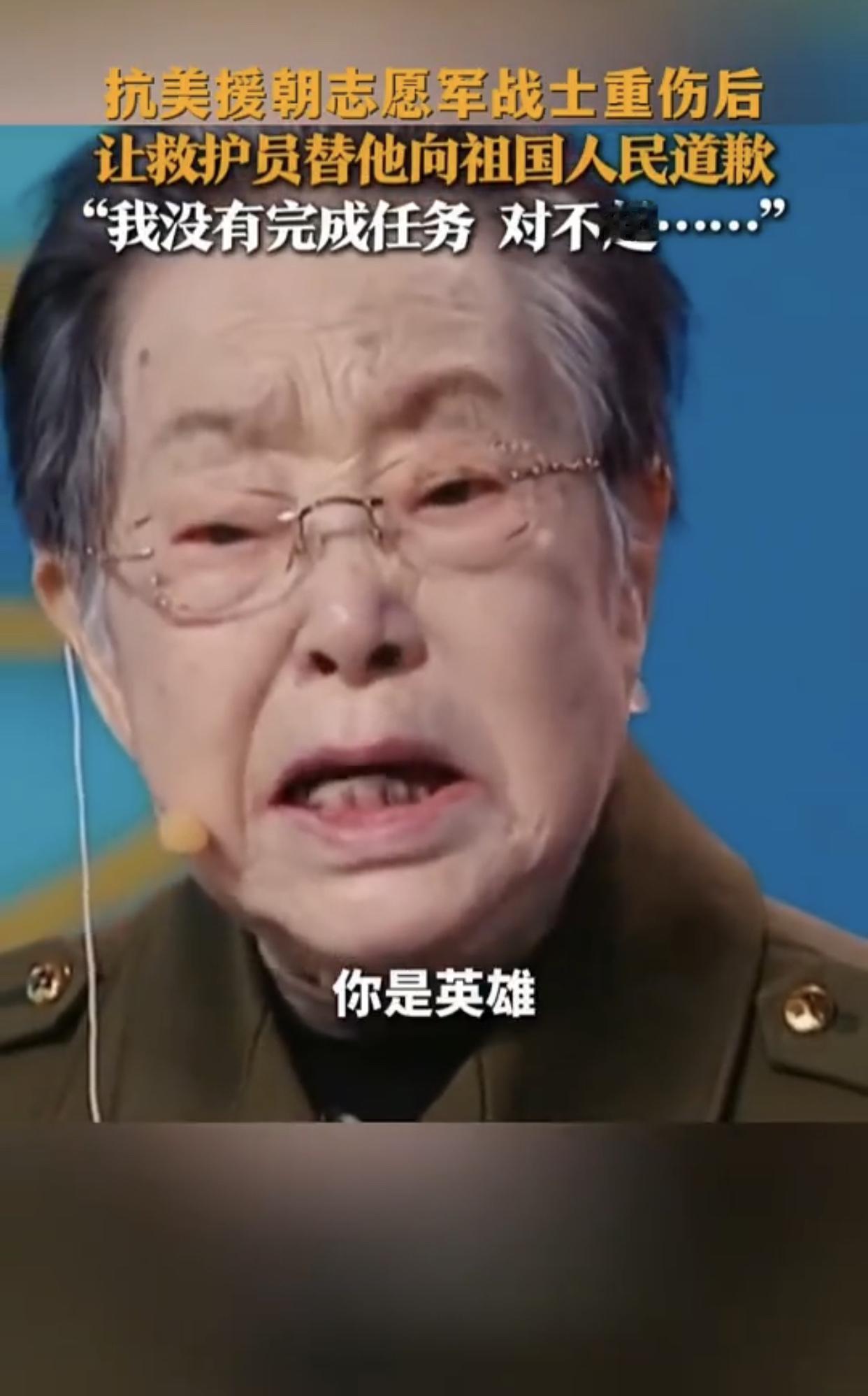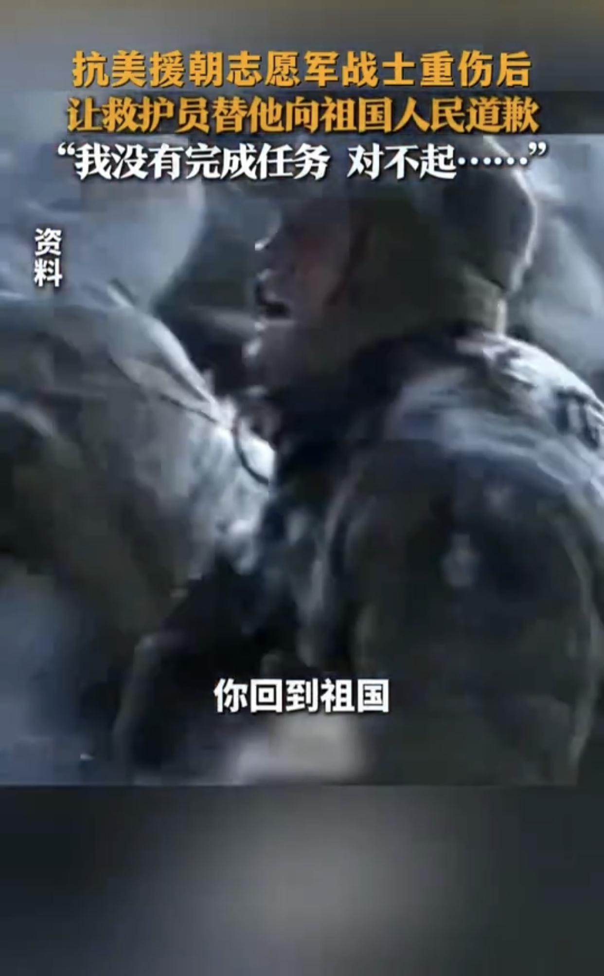 一位抗美援朝救护员讲述在朝鲜战场上的志愿军英雄: “他(受伤战士)的情况,嘴大概还剩三分之一,只有一个胳膊一个腿,他对我说,‘你回到祖国,一定要替我说,我对不起党,对不起毛主席,对不起祖国人民,我没有完成任务‘,我说,’指导员,你是英雄,你的兵都是英雄‘。” “75年前,你们告别家乡的温暖,奔赴冰天雪地的战场,以血肉之躯筑起抵御外敌的钢铁长城! 谢谢你们用生命捍卫祖国的和平,为我们换来这盛世安宁!”