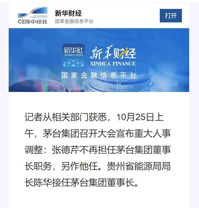 【#茅台集团换帅##陈华接任茅台集团董事长#​​​】记者从相关部门获悉,10月25日上午,茅台集团召开大会宣布重大人事调整:张德芹不再担任茅台集团董事长职务,另作他任。贵州省能源局局长陈华接任茅台集团董事长。(新华财经) ​​​
