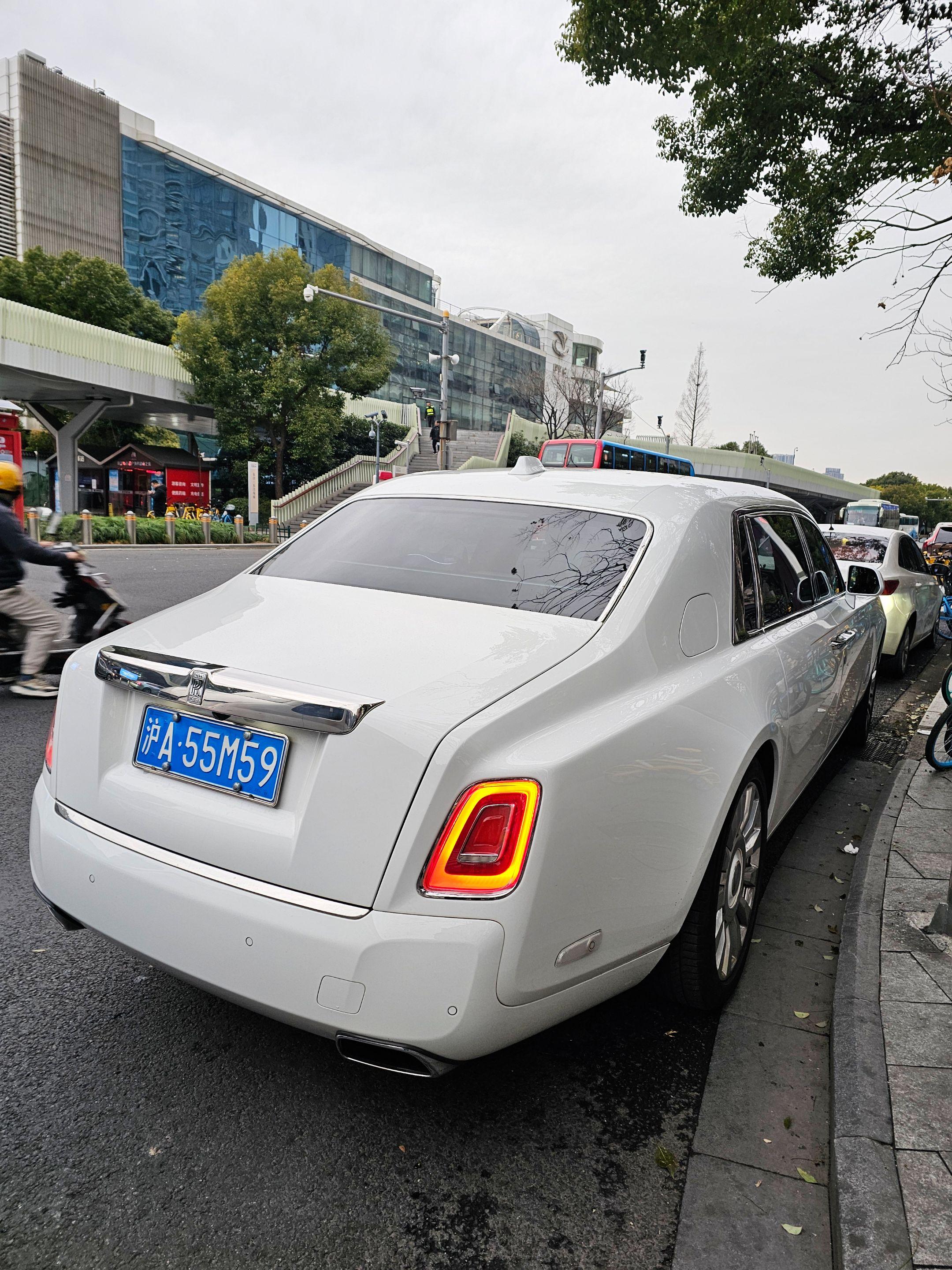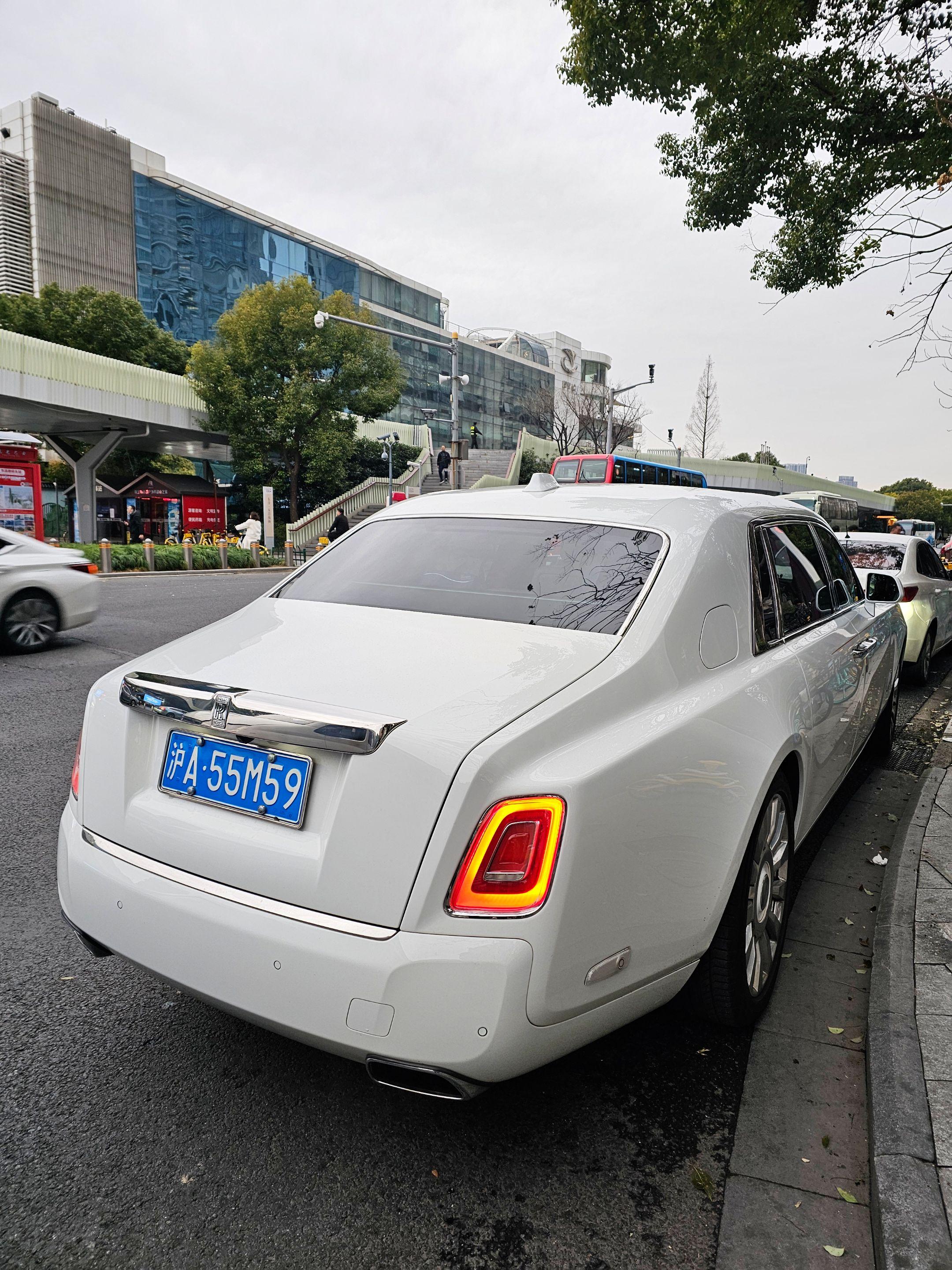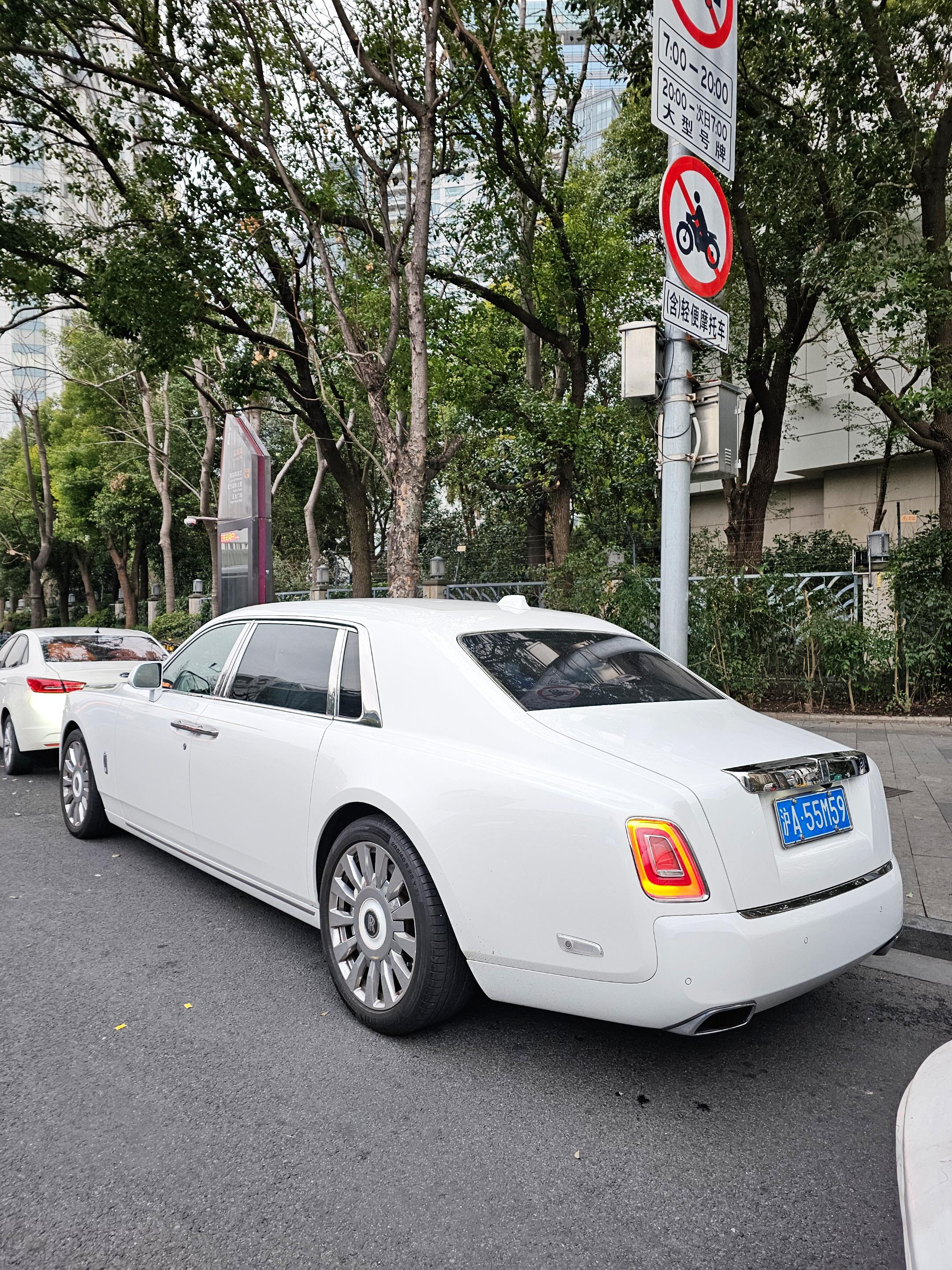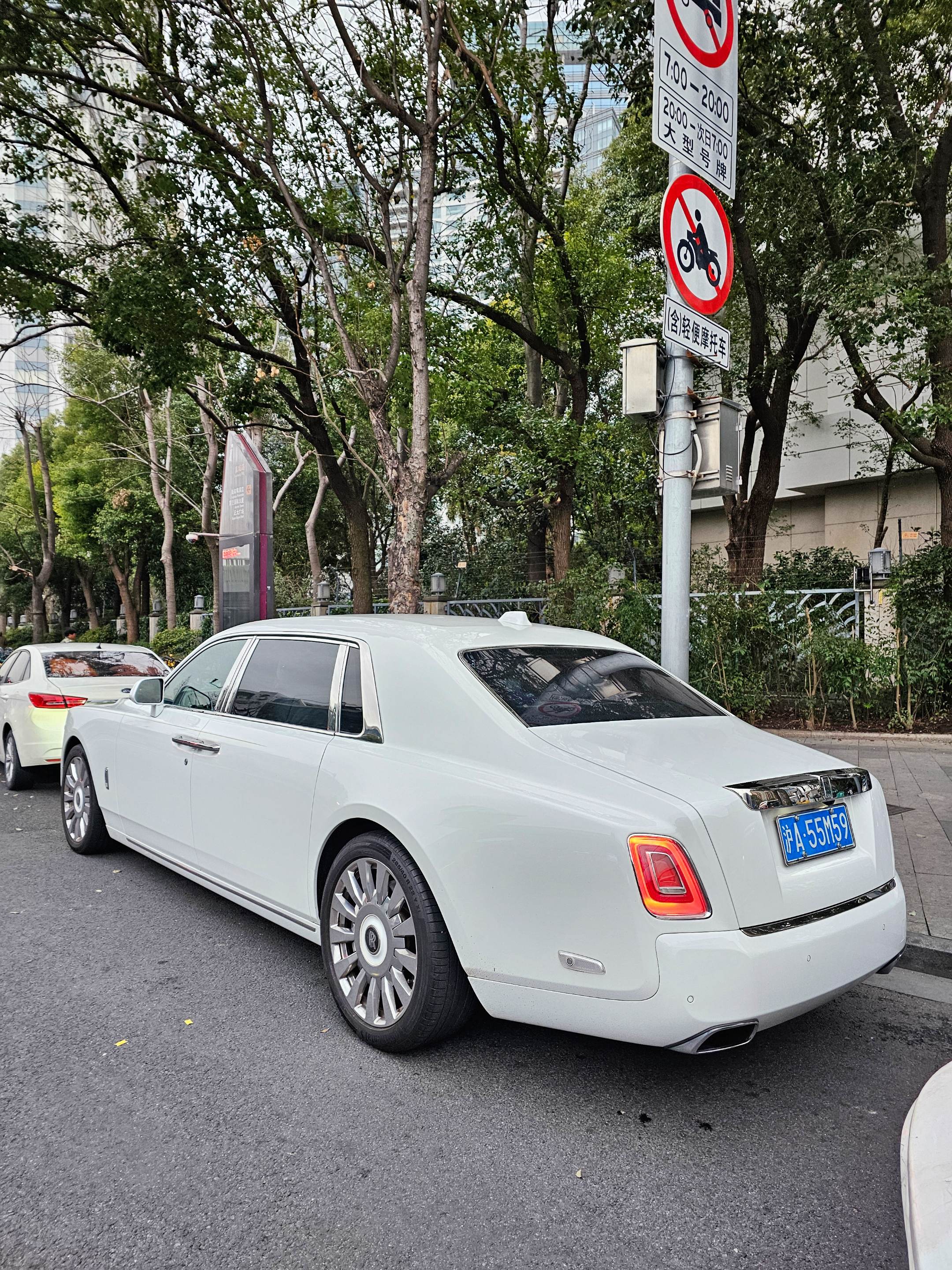 上海陆家嘴偶遇神秘大佬座驾劳斯莱斯幻影加长版,白色双拼色的外观配上22寸大轮毂奢华的内饰座椅,气场强大优雅霸气十足