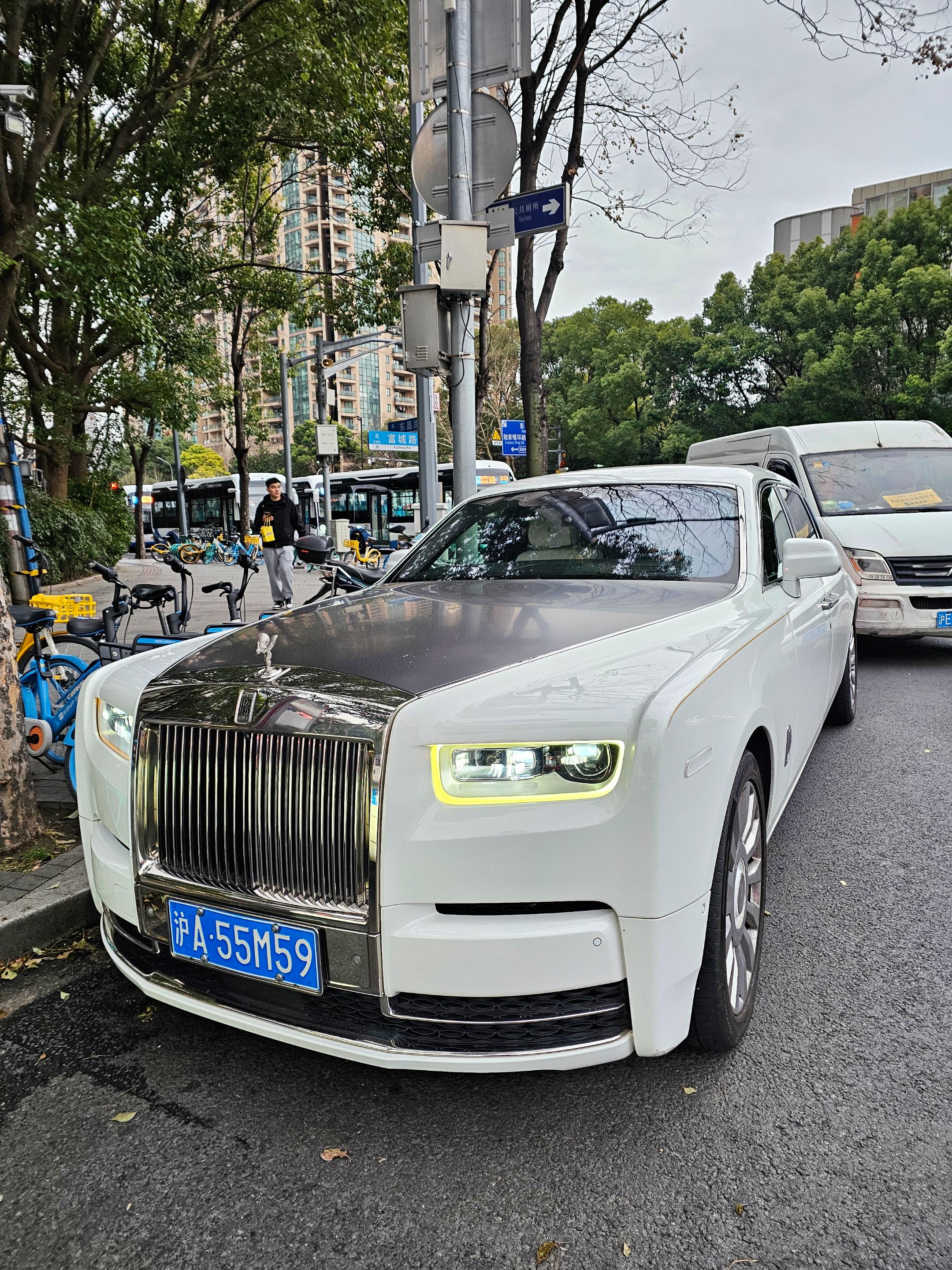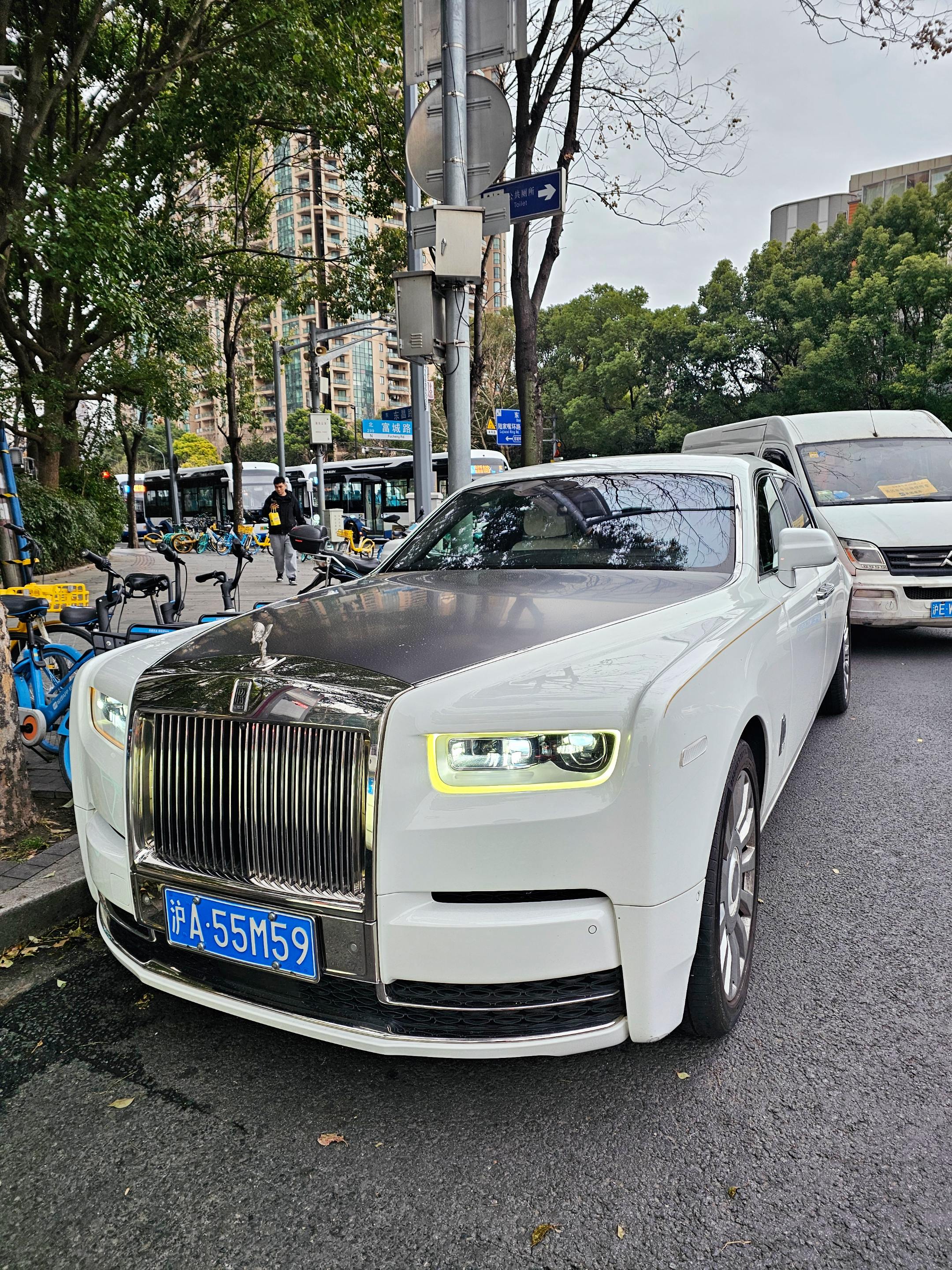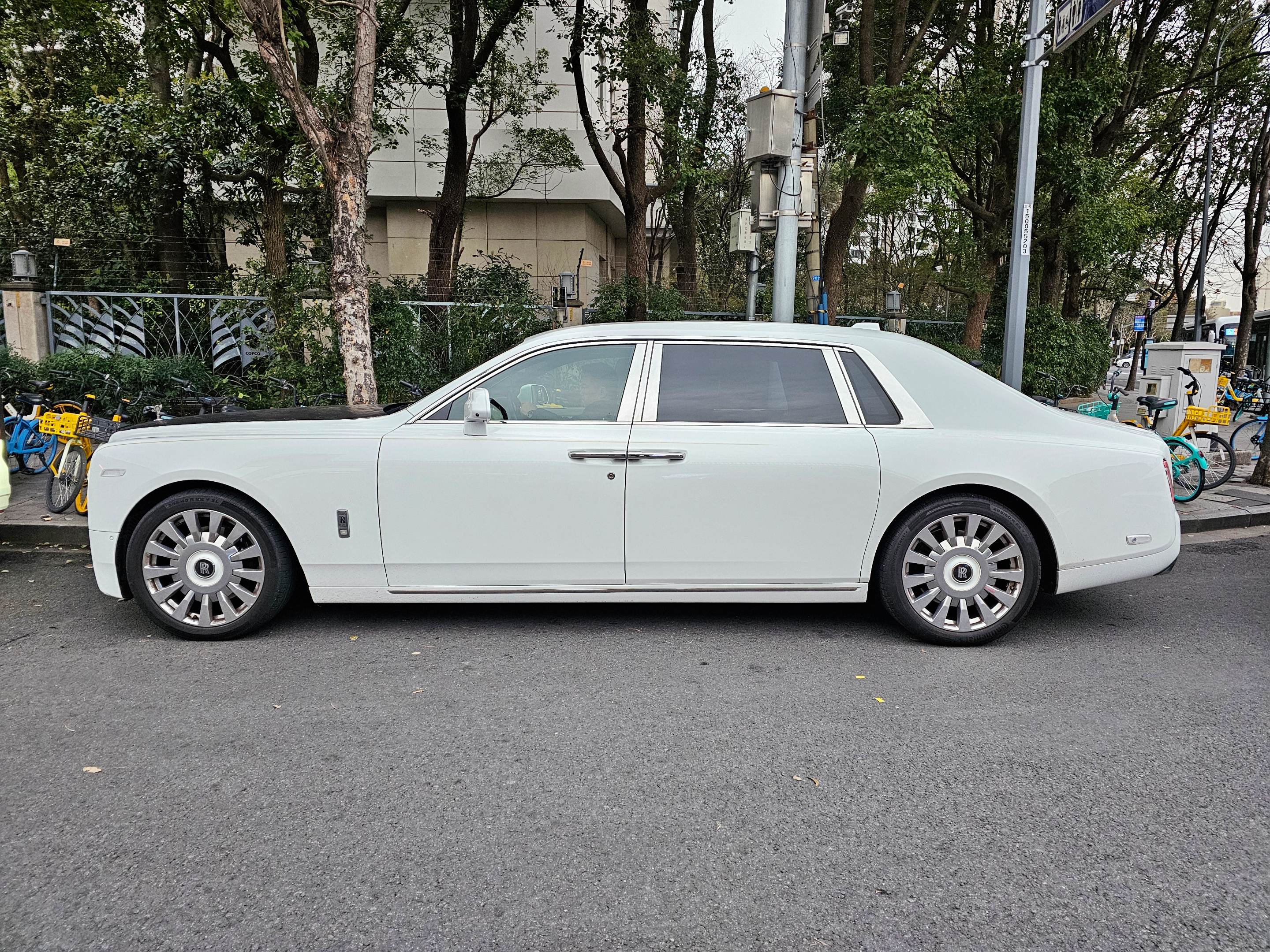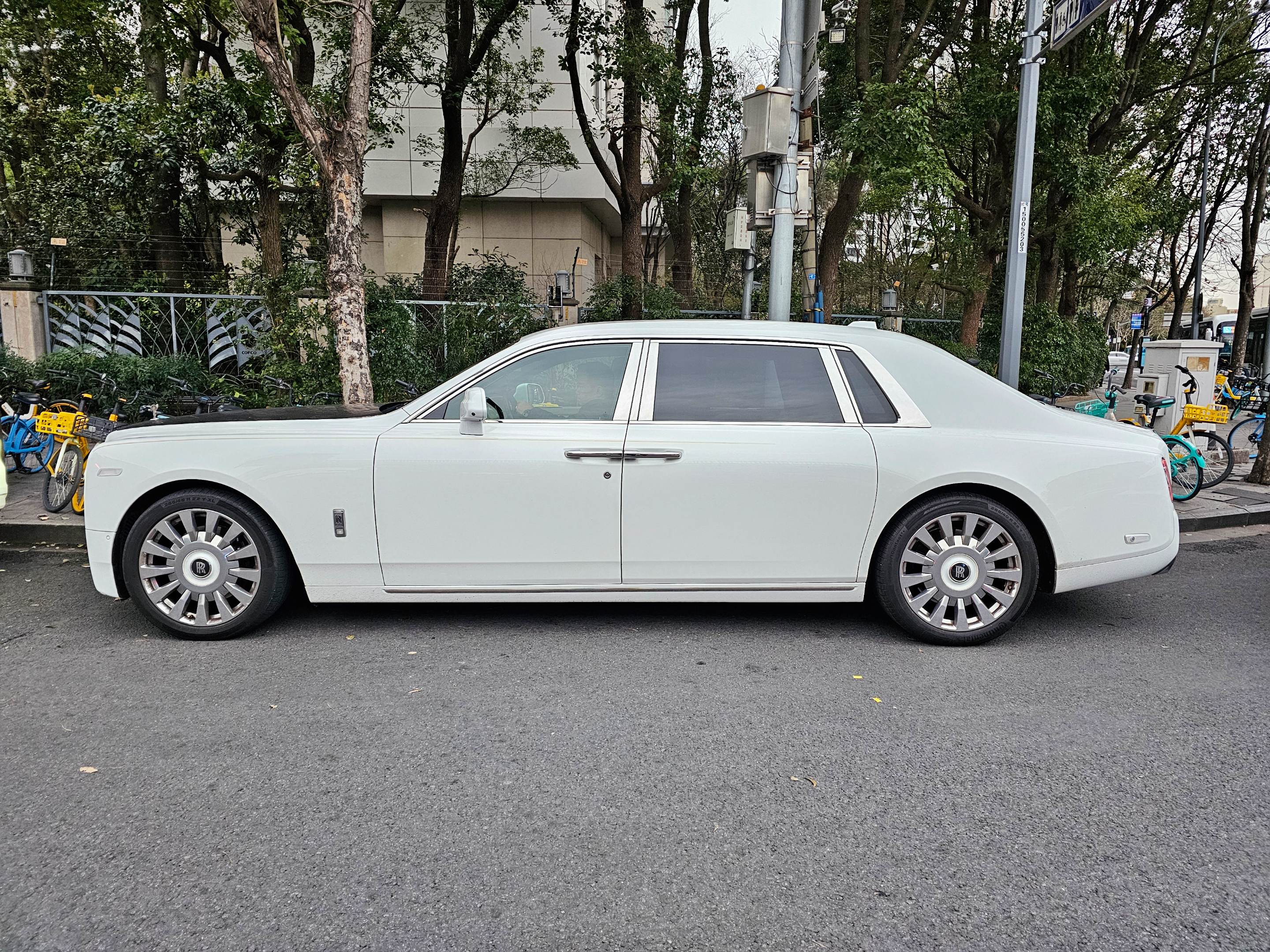 上海陆家嘴偶遇神秘大佬座驾劳斯莱斯幻影加长版,白色双拼色的外观配上22寸大轮毂奢华的内饰座椅,气场强大优雅霸气十足