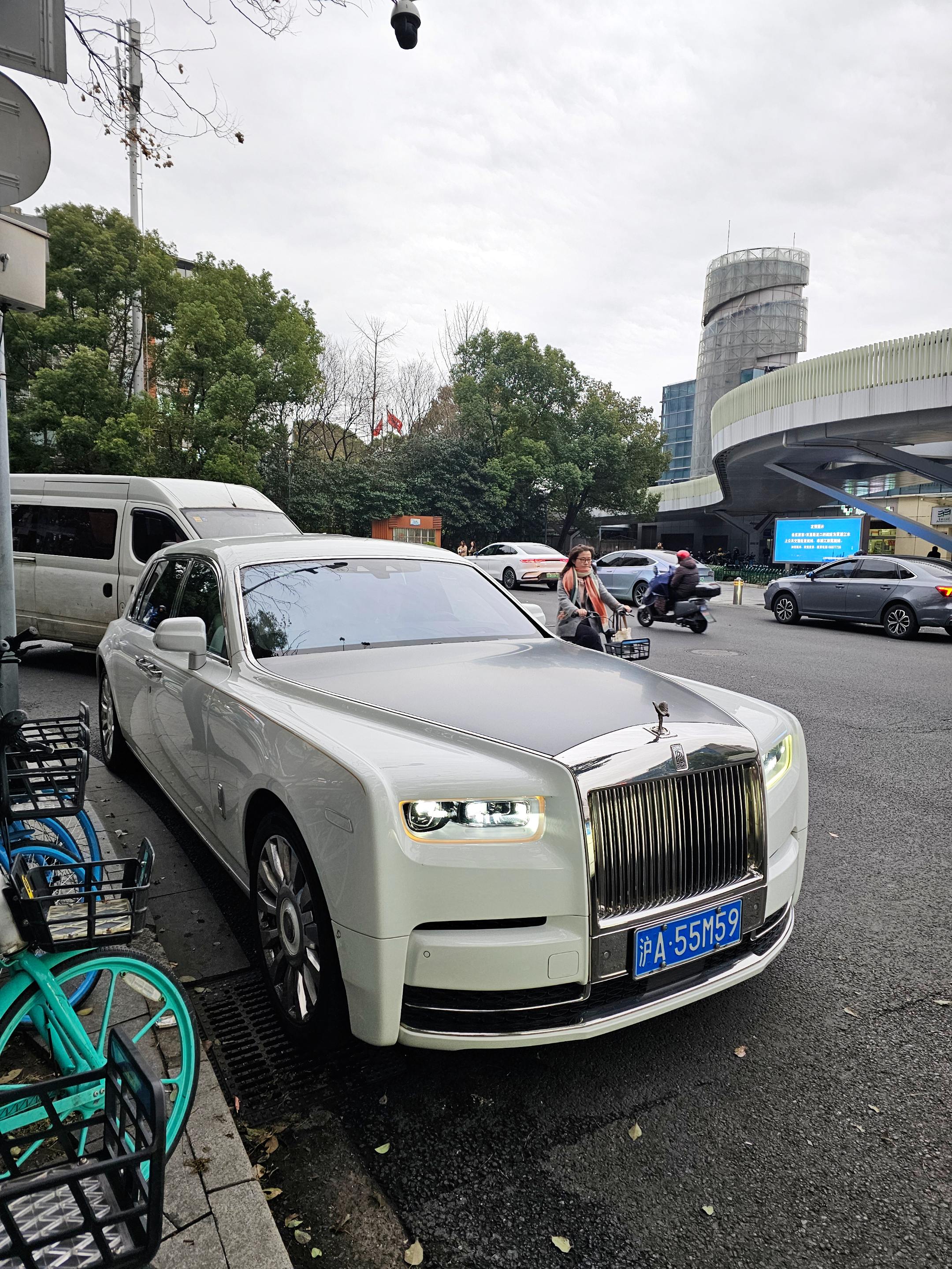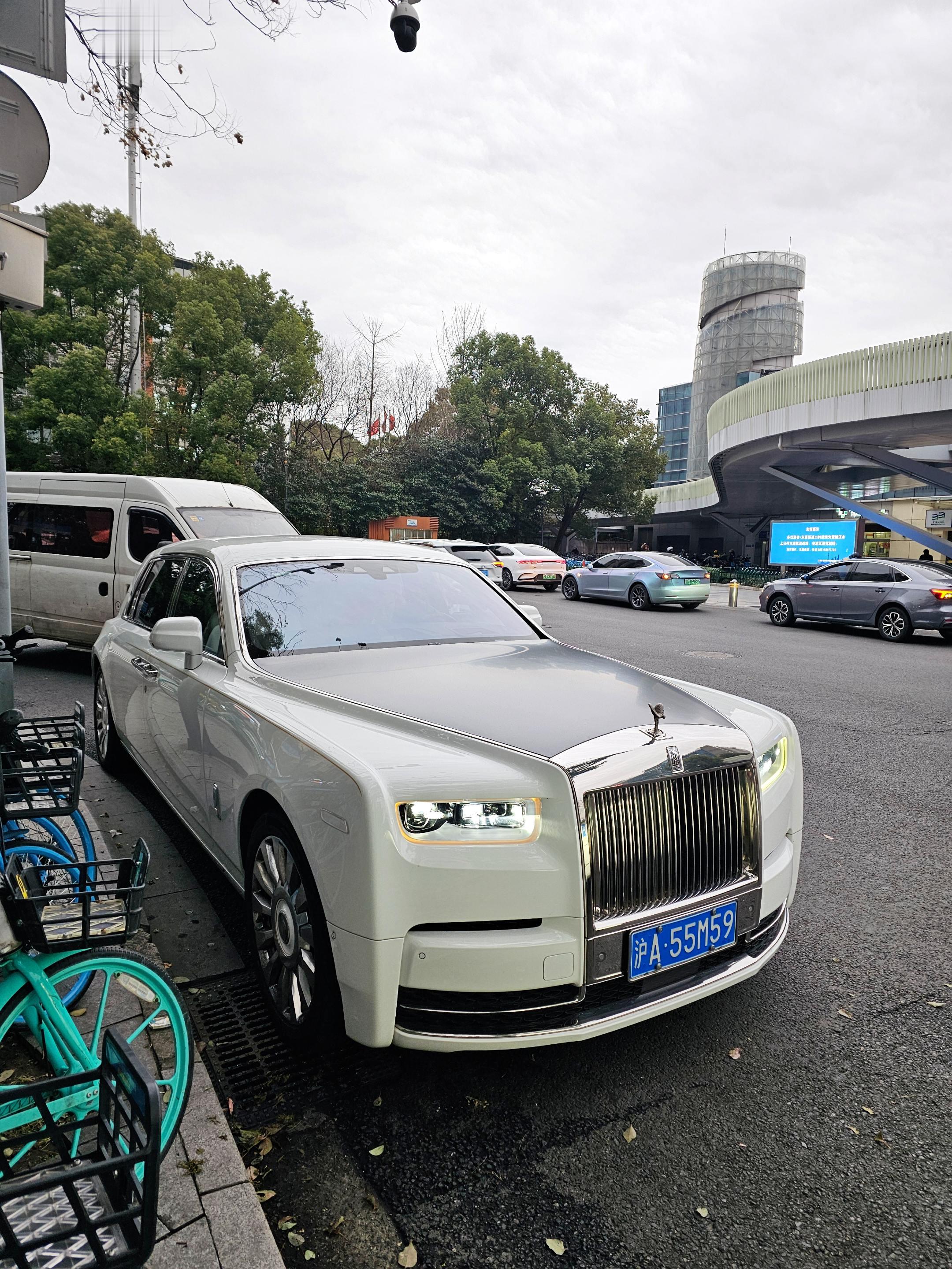 上海陆家嘴偶遇神秘大佬座驾劳斯莱斯幻影加长版,白色双拼色的外观配上22...