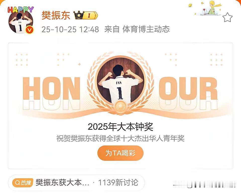 樊振东的大本钟奖颁奖词是这样说的:他以球拍为笔,在世界乒坛书写中国传奇。以行动为旗,引领新一代运动员的担当。大本钟奖估计是他无心插柳柳成荫。大本钟奖是世界华人精英在国外设置的华人奖。 我看了这十大精英的名单: 第一个是台北市长蒋万安。 樊振东位列第二。 奥运会跳水冠军,公益使者林跃第三。 第四个是爱尔兰都柏林市前市长绿党党主席朱颂霏。 第五个是演员舒淇。 第六个是时代周刊亚洲封面人物谭元元。 第七个是非物质遗产传承人蔡龙。 第八个是小红书的创始人毛文超和翟芳。 第九个是美国神经系统科学家凯•泰伊 樊振东今年正好在德国打球,正所谓有心栽花花不发,无心插柳柳成荫。在国内没得到的奖在国外得到了。