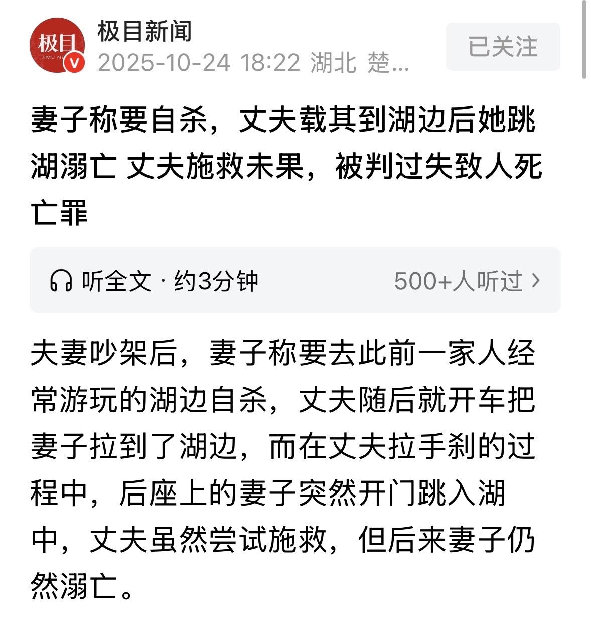 黑龙江哈尔滨,夫妻二人因琐事吵架,妻子崩溃之下,说要去一家四口常去的湖边一跳了之,丈夫也不拦着,干脆顺了妻子的意,他开车把妻子拉到湖边,谁知刚拉好手刹,妻子就开车门跳进了湖里,丈夫看妻子竟动真格,慌忙跳下去施救,施救未果后,他连忙报警,可妻子还是溺亡了,法院判决出乎意料。 2023年9月的一个晚上,冯某又和妻子迟某因为生活中的小事吵得不可开交。 当晚,迟某气得拎起挎包摔门而出,冯某怕出事便跟了出去,俩人在居民楼单元门口的台阶上继续争执。 这日子没法过了!迟某哭着钻进自家轿车后排座,她情绪崩溃地嚷嚷着让冯某开车带她去孩子常玩的城郊人工湖,说要结束这一切。 冯某知道,妻子说的那片湖离小区不过20分钟车程,平时周末常带孩子去划船钓鱼,而且水也没多深,淹不死人。 想着妻子只是说气话,他没多劝阻就发动了汽车。 夜里11点,俩人来到了湖边停车场,冯某刚拉起手刹,妻子迟某就猛地推开车门往湖边跑。 冯某这下傻眼了,他没想到妻子竟然来真的,他赶紧追上去拽住妻子胳膊,可对方挣脱后直接往深水区蹚。 冯某水性一般,跟着下到齐胸的水里试图把人往回拉,但醉酒的妻子力气大得惊人,几次挣脱后反而往更深处走。 冯某知道自己再往前跟过去,只会把自己也搭进去,他大喊:救命啊!有人掉水里了!边喊边往岸上跑。 正巧附近有两位夜钓的退休工人,他们听见动静后抄起钓竿就冲过来。 冯某接过鱼竿试图让妻子抓住,但迟某并不配合,只是摇头哭泣,身子也开始慢慢往下沉。 见施救无效,冯某哆嗦着拨通110和119,说话时舌头都打结。 消防和民警很快赶到现场,用强光手电扫遍湖面,却不见迟某人影。搜救队也连夜打着手电筒在齐腰深的水里来回摸索。 直到第二天下午1点多,他们才在距离岸边30多米的淤泥里找到迟某的遗体。 法医鉴定后确认,迟某是溺水身亡,胃里残留的酒精浓度高达每百毫升180毫克。 庭审时,冯某的辩护律师提交了多份证据。 根据夫妻俩的邻居证言显示,两人经常争吵但还是有感情基础的,其次,冯某在事发后主动赔偿岳父母20万元并获得了书面谅解,另外,还有两个未成年孩子需要冯某这个父亲抚养。 庭审时,冯某也承认自己方式太大意了,并表示如果能重来,他拼了命也要把妻子拽住。 那么,从法律角度来看,冯某对妻子迟某的死亡是否构成过错?又将承担怎样的法律责任? 《刑法》第233条规定:过失致人死亡的,处三年以上七年以下有期徒刑;情节较轻的,处三年以下有期徒刑。本法另有规定的,依照规定。 法院审理认为,冯某作为完全民事行为能力人,在妻子明确表示"想去某湖自杀"且情绪极度不稳定的情况下,应当预见到将对方带至熟悉水域可能引发的危险后果。 但他基于水不怎么深、平时常带孩子游玩的既往经验,轻信妻子只是说气话,这种过于自信的过失直接导致危害结果发生。 根据《刑法》第15条,过于自信的过失需同时满足"已预见危险可能性"和"轻信能够避免"两个要件,冯某的行为完全符合这个特征。 法院认为,冯某已经构成过失致人死亡罪,但情节较轻。 第一,案子因家庭矛盾引发,区别于一般社会恶性犯罪。 第二,冯某在案发后实施了积极的救助行为,包括尾随阻止、寻求夜钓者协助、报警求助等,体现他的主观悔意。 第三,冯某事后赔偿被害人近亲属经济损失并取得谅解,符合《最高人民法院关于常见犯罪的量刑指导意见》中"积极赔偿被害人经济损失并取得谅解"的从宽处理情形。 这些因素构成了情节较轻的认定基础。 最终,冯某被判处有期徒刑一年,缓刑两年。 有人认为,判得太轻了,丈夫明明知道妻子要去跳湖,而他却偏偏载妻子到湖边,这应该是故意杀人,应该重判,毕竟是一条人命。再说了,妻子自杀的原因是夫妻不和,与丈夫有直接关系。 两夫妻吵架,一方说自杀,另一方如果激将,成功率很大,我们这儿也有,妻子说要跳河,丈夫说有本事你跳!吓唬谁呢?结果妻子出门奔向河边,自杀成功!这责任怎么算? 尽管赔偿了,但作为丈夫,不应该将激动中的妻子载去湖边,这行为难道不是间接的送她走上不归路吗?但希望看到这个案例的女性,冲动时,想死是最愚蠢的行为,你死了,你的父母和孩子会终身有心理阴影,连死都不怕,还怕活着? 也有人说“激将法”并不是对每个人都能产生有效的作用,这要因人而异,他这两个人就是拉不回头的犟牛,最终导致如愿以偿的出现事故! 对此,你怎么看? 关注@运良说法. 学法律知识不迷路