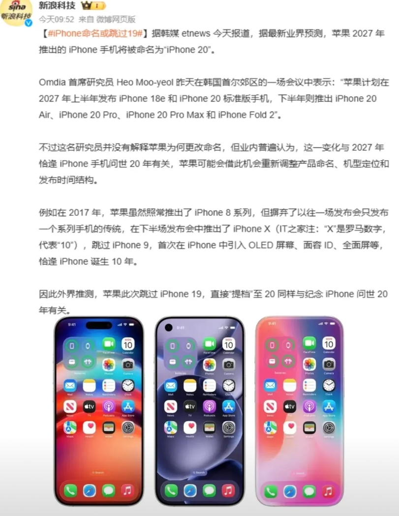 还好改的是iPhone19!iPhone18的梗还能玩 据媒体etnews报道,2027年推出iPhone可能会叫iPhone 20系列,因为2027年恰逢iPhone问世20年 还好不是跳过iPhone 18,不然明年都不能用爱情公寓胡一菲那张图了 另外可能就有人要问了,要是iPhone跳过19改名20,还会不会有品牌继续对标呢?
