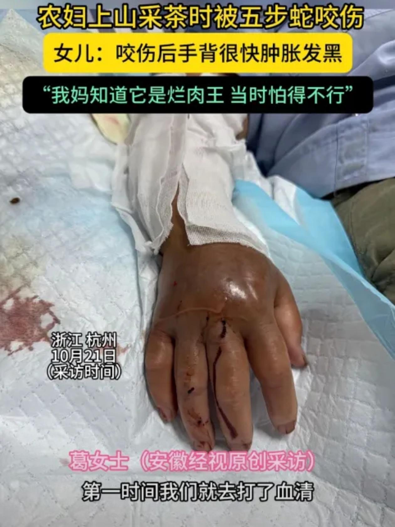"悲剧还是发生了!"浙江杭州,一女子上山采茶叶时,万万没想到茶树丛里竟藏着致命杀机,一阵刺痛从手背传来,她本能地缩回手,却看到两个针眼大的伤口正往外渗着发黑的血珠。 这可把女子吓得够呛,她赶紧扒开面前的茶树枝,一条盘成S形的花斑蛇正吐着信子,三角形的脑袋冲着她的方向,那独特的花纹她认得,这是五步蛇啊。 女子的腿一下子软了,她在山里生活了几十年,早就听老人讲过五步蛇的厉害,这玩意儿的毒素能让人的肌肉组织坏死,民间给它起了个吓人的外号叫"烂肉王",被咬中的人如果不及时处理,整块肉都会烂掉。 她顾不上采摘的茶叶,捂着手背就往山下跑,跑了还不到五分钟,整个手背就开始发热肿胀,原本白皙的皮肤变得乌青发紫,两个针眼周围的皮肤更是呈现出可怕的黑色,像被墨水浸透了一样。 到了镇上的医院,医生一看伤口就知道情况严重,立刻给她注射了抗蛇毒血清,可女儿看着母亲那肿得像馒头一样的手,心里还是不踏实,连夜开车把老人送到了安徽的一家专治蛇伤的医院。 那家医院的老中医是出了名的治蛇伤高手,他先把几味草药捣碎敷在伤口周围,又拿出一根细针在肿胀的部位扎了十几下,黑紫色的血顺着针眼流出来,老中医一边放血一边说,毒素要是不尽快排出去,这手就保不住了。 经过半个多月的调理,女子手背上的黑色总算褪去了,肿胀也消了下去,只是留下了两个小疤痕,好在没伤到筋骨,手指还能正常活动,这才算是捡回了一只手。 网友们看了视频后纷纷留言:"五步蛇这名字可不是白叫的,毒性太猛了。""幸好送医及时,要不然后果真不敢想。""以后上山采茶得穿长袖戴手套,命比茶叶金贵。" 这事儿背后其实藏着个现实问题,这些年生态环境确实变好了,蛇的数量也跟着多起来,特别是南方的山区和农田,经常能碰见各种蛇类,有的趴在石头上晒太阳,有的藏在草丛里乘凉,一不小心就会踩到或者碰到。 老话说得好,害人之心不可有,防人之心不可无,这句话放在蛇身上也合适,咱们不去主动招惹它,但也得提防着点,出门的时候穿上长裤长袖,拿根棍子敲打草丛,把蛇赶走再走过去,这都是保命的法子。 要是真被蛇咬了,千万别慌张,先记住蛇的模样,是什么颜色,脑袋是啥形状,身上有没有花纹,然后赶紧去医院,医生才能根据蛇的种类找到对应的血清,时间耽搁一分钟,危险就多一分,这或许就是山里人必须懂的生存智慧吧。