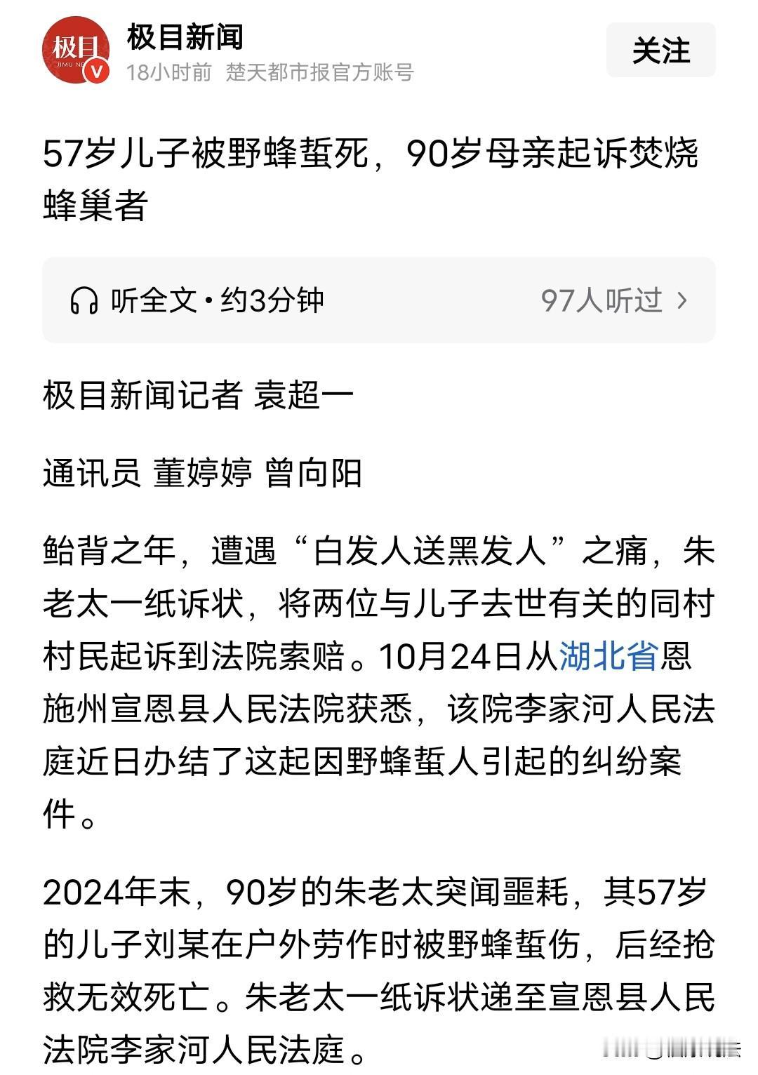湖北恩施,57岁男子上后山干农活,被野蜂蜇死,90岁老母亲突闻噩耗报了警,原来前一周,有2名村民用焚烧方式赶走野蜂,把蜂巢摘下来卖钱了,因此,老母亲认为儿子上后山才被“无家可归”的野蜂袭击,遂将2村民告上法院,没等案件审完,老母亲与世长辞,其女儿替弟弟维权,2村民表示已经垫付医疗费,尽到道义责任,不愿赔偿。法院会怎么判呢? 2024年年末,57岁的男子刘某向往常一样,去家后山去干农活,没想到,遇到了野蜂被蜇伤,送到医院没有抢救过来,就这么走了。 刘某90岁的老母亲朱老太突然得知儿子去世的噩耗,觉得天都塌了!一时间白发人送黑发人,她心里痛不欲生,思来想去,觉得儿子死的冤啊,他只是去干活怎么就被野蜂蜇死了? 朱老太报了警,得知村里有2个人去后山摘蜂巢了,她觉得这事和这俩人脱不了关系,于是,她将二人告上法院要求赔偿。 原来,摘蜂巢这事是同村的夏某和李某干的,在事情发生一周前,夏某和李某在刘某家后山发现了一处野蜂窝,两人欣喜不已,蜂巢能卖钱啊,这要是弄来也能赚点。 于是,夏某、李某一拍即合,两人一番商量,怎么取蜂巢比较安全,然后,商量妥当后,就带着东西去了后山。 到了后山,夏某、李某用焚烧的办法把野蜂赶走,然后,把蜂巢给摘下来拿去卖了。 谁能想到,一周后,刘某去后山干活时,那些无家可归的野蜂像发了疯似的,对着刘某就冲过去了,刘某被蜇伤,命也没了。 这边,夏某、李某二人卖了钱之后沾沾自喜,一来觉得除了野蜂消除了安全隐患,二来摘下蜂巢也赚了一笔,可他们没想到,因为这事,90岁的朱老太给他俩告了。 夏某和李某对朱老太儿子的遭遇很同情,出于道义,二人还主动给刘某垫付了医疗费。 然而,朱老太觉得儿子的死和夏某、李某焚烧蜂巢的行为脱不了干系,非得让他们赔偿不可。 可是,诉讼过程中,朱老太因为年纪大了,身体本就不好,再加上儿子突然没了,这打击实在太大了,没等案件审理结束,老太就去世了。 朱老太与世长辞后,她的女儿刘某芬,也就是刘某的姐姐站了出来,接着帮弟弟讨公道,她成了新的原告。 刘某芬态度也很坚决,为了了却母亲的遗愿,为了给弟弟讨个说法,她坚持要求夏某、李某赔钱不可。 夏某和李某也觉得委屈,这事发生后,他们也很难过,还给刘某垫付了医疗费,这已经算是进了道义上的责任了,不想再额外赔钱了。 双方各有各的理,调解陷入了僵局,谁也不肯让步。 这件事的矛盾点在于:夏某、李某为了得到蜂巢,用焚烧的方式赶走野蜂,最后摘了蜂巢去卖钱。 过了一周之后,刘某上后山干活,但是出事的地方和摘蜂窝的地方还有一定距离,所以,要想确定这里面的因果关系太难了。 那么,夏某、李某要承担法律责任么? 《民法典》第1165条规定:行为人因过错侵害他人民事权益造成损害的,应当承担侵权责任。 从常理来讲,夏某和李某焚烧蜂巢后摘除并出售,使得原本在该处栖息的野蜂失去了蜂巢。 野蜂可能因为“无家可归”而变得更有攻击性,当刘某一周后在同一片后山劳作时,就容易遭到野蜂群的袭击。 虽然,不能绝对地说焚烧蜂巢这个行为就一定会导致刘某被蜇身亡。 但从一般的社会经验和常识判断,这种行为增加了刘某被野蜂攻击的可能性,和刘某的死亡结果存在一定的关联性。 所以,需要依据法律和实际情况来判定是否存在法律上的因果关系。 法院从派出所的询问笔录中找到突破口,笔录中:夏某、李某表示,他们也不确定是否把野蜂都赶干净了。 《民法典》第1173条规定:被侵权人对同一损害的发生或者扩大有过错的,可以减轻侵权人的责任。 本案中,夏某、李某为了摘取蜂巢,通过焚烧方式驱赶野蜂并摘除蜂巢,但他们没有考虑这么做可能会让野蜂变得更有攻击性,对周围人的安全造成威胁。 而且,二人并且没有采取进一步的措施来根除危险,也没有对可能进入后山的人进行安全提示。 从法律角度来说,夏某、李某没有尽到合理的安全保障义务,对刘某的死亡结果存在一定的过错,所以应当承担相应的法律责任。 不过,刘某作为成年人,在户外劳作时自身也有一定的注意义务,如果刘某自身存在疏忽大意等情况,可能会在一定程度上减轻夏某和李某的责任。 因此,法院认为,夏某、李某焚烧蜂巢和刘某被野蜂蜇之间还是有一些关联的,应该给刘某家属一些补偿。 最终,经过调解,由夏某、李某赔偿刘某芬3万元补偿款,刘某芬也撤诉了。 有人说,野蜂如果被人用火焚烧、但是外面的蜂子没有回去,家被人毁了,它会四外复仇,可在一公里内蜇人,还是挺危险的。对此你怎么看呢? 关注@福康说法 从日常点滴学法律,生活安稳更有底
