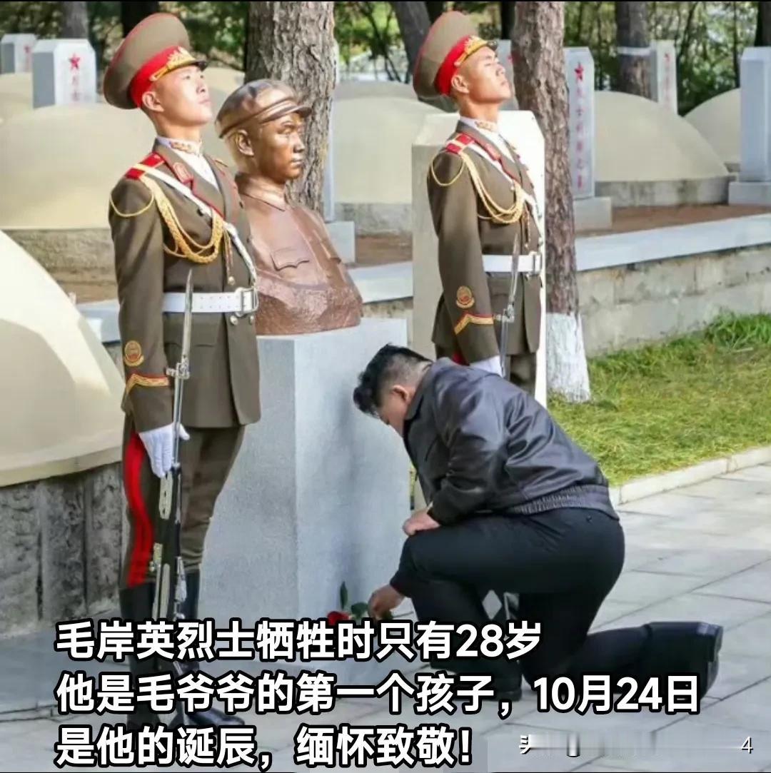 在抗美援朝纪念日的前夕24日,金正恩单膝跪地向毛岸英墓献花!