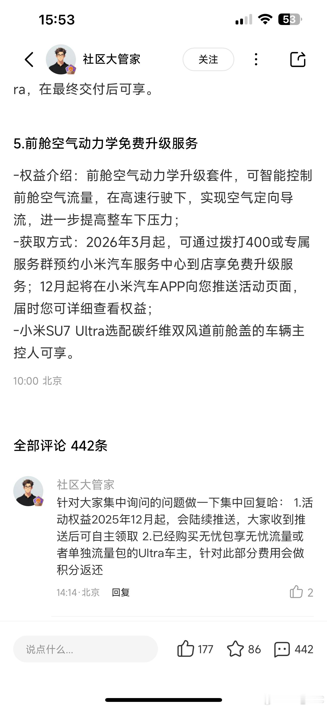 小米开始为SU7 Ultra用户增加权益,包括无限流量、无忧包不限时、智驾保障服务,以及风道升级。