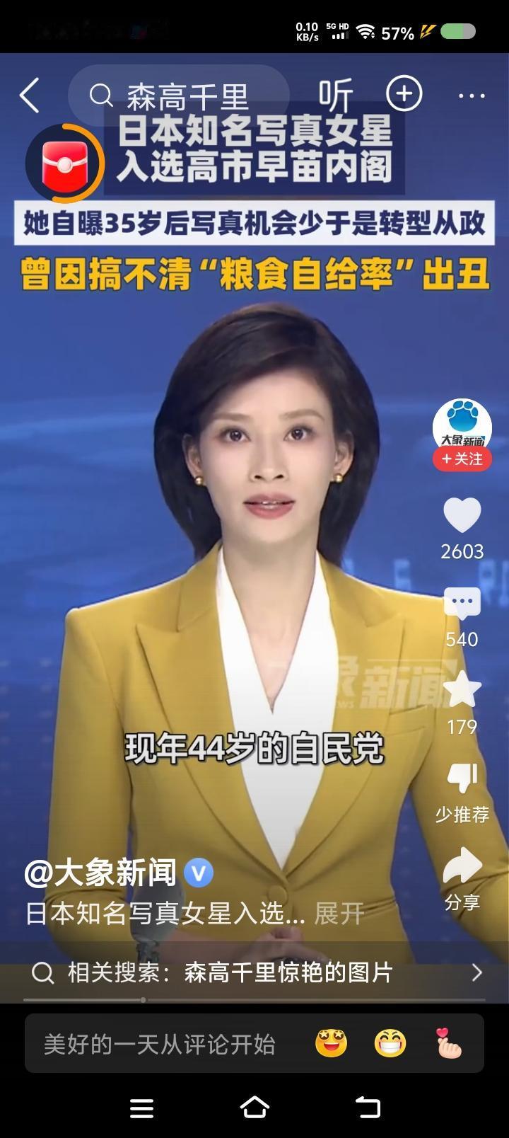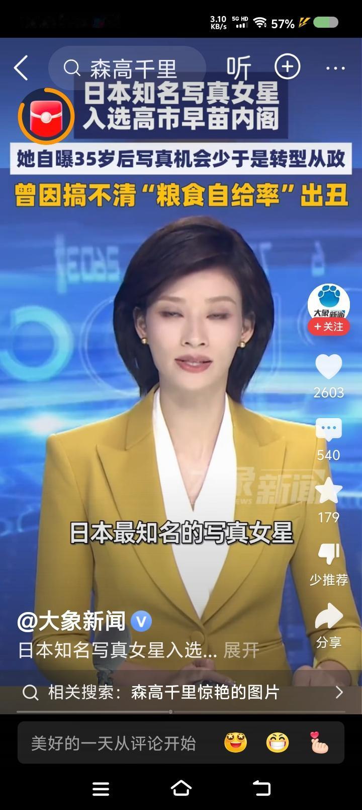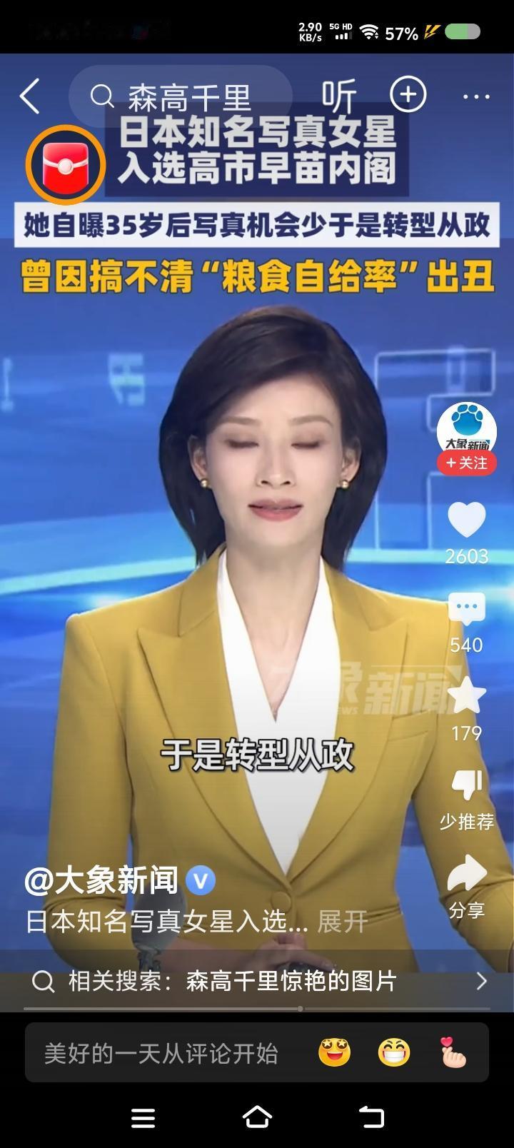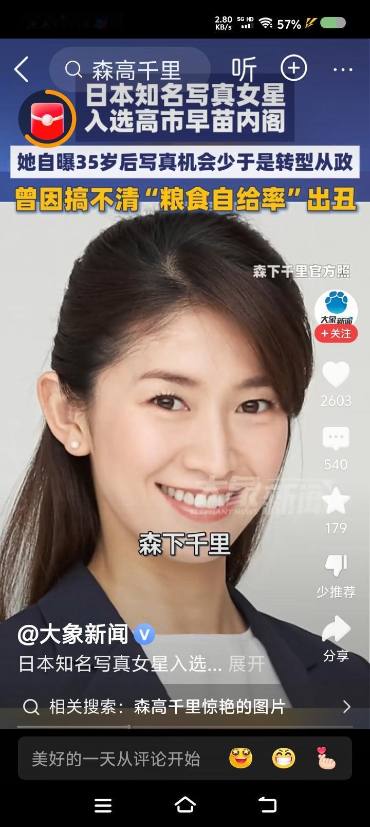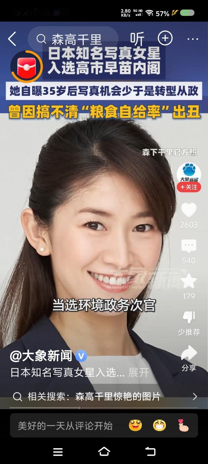 日本没人了?—— 据报道,日本写真女星森下千里入选内阁,担任环境政务次官。她自曝35岁后写真机会少于是转型从政。 点评: 不少网友为日本背书:“人人平等。” 呵呵,这些人瞎了,还是睁眼说瞎话?看不见她从政理由?贱中贱!连常识也不要了?