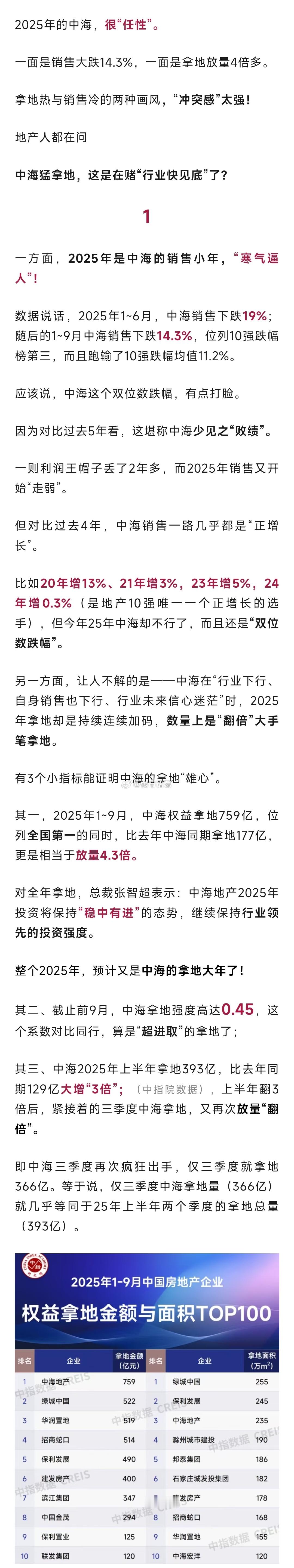 一边是销售下滑14.3%,一边是拿地激增4倍多,中海到底在打什么算盘?这是在赌行业即将触底反弹吗?