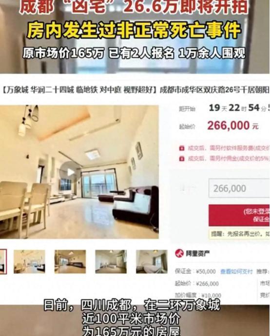 这你敢买吗?成都,一套二环内近百平米“凶宅”标价26.6万元出售,上万人围观,目前仅有两人报名,销售:房内发生过非正常死亡事件。 近日,某拍卖公司拍卖的成都千居朝阳小区内的一套房产引发网友热议。 该小区距离万象城仅有不到800米,附近就有学校和公园,交通十分便利,换作平常,这里的房子都是供不应求。 而拍卖的这套近100平米的房子即便是套二手房,但正常价格也在165万元左右,这次之所以给了26.6万元的超低起拍价,主要还是因为它是套凶宅。 根据拍卖公司公示信息显示,此前有租客在屋内非正常死亡,拍卖公司明确标注对此有迷信的需谨慎购买。 作为坚定的唯物主义者,笔者肯定是不信这鬼神之说的,但很多人一看到“凶宅”二字还是胆颤心惊,不少网友表示这种房子很可能“阴魂不散”,哪怕是白给都千万不能要。 结果就是眼看距离最后的拍卖还有十几天时间,虽然有上万人围观,但截至目前仅有两人报名参加,大多数人还是望而却步。 当然,除了是“凶宅”这一负面因素之外,整套房子无论是户型还是区位都是十分优越的,以这个价格拿下也是十分实惠的。 而且拍卖公司还表示该房产未涉及产权纠纷和历史欠费,只要拍卖成功就可以顺利过户。 面对如此巨大的优惠力度,也不知还会不会有新的勇士加入竞拍。 那问题来了,如果是你恰好在成都打拼,是否敢参与竞拍呢?