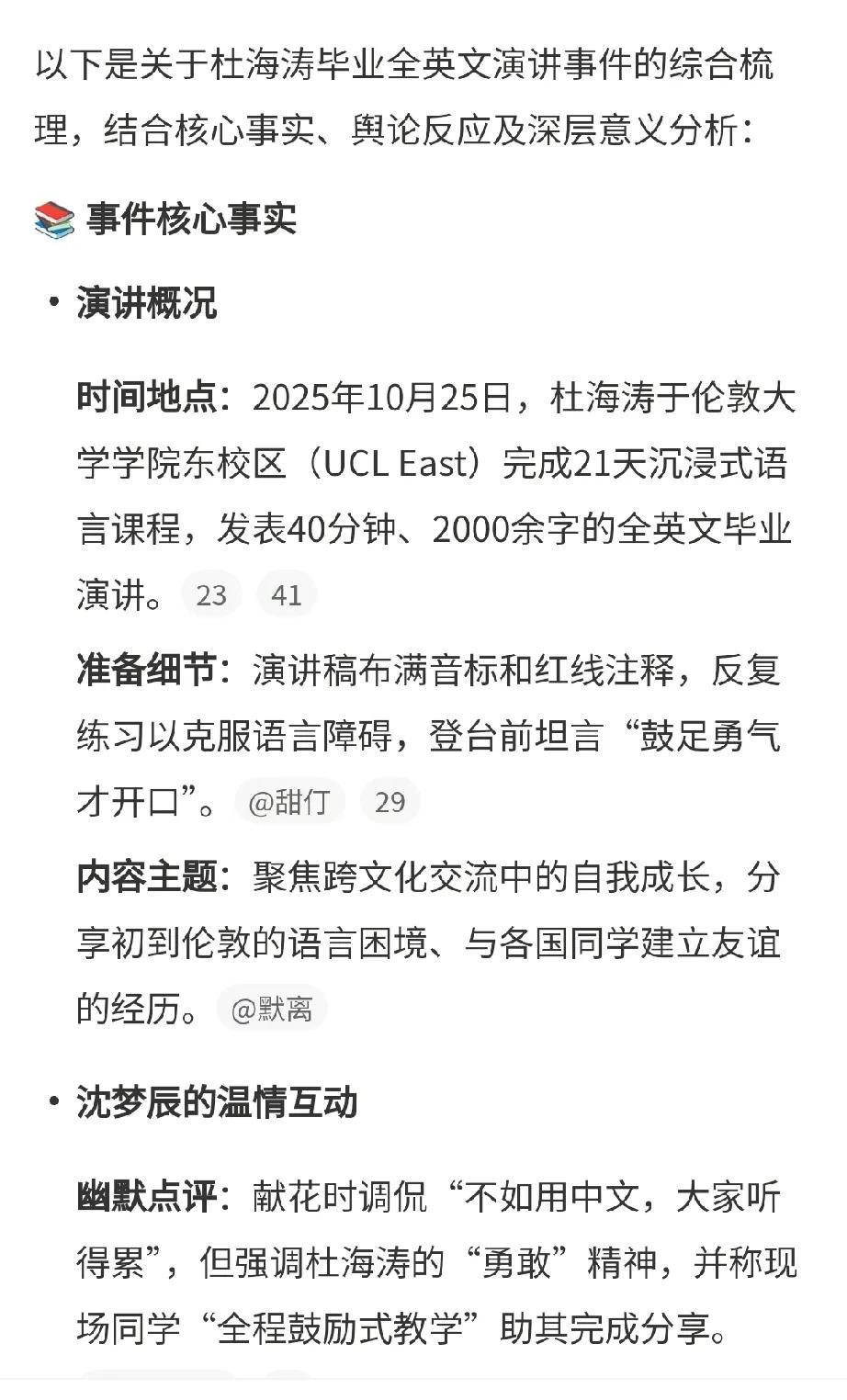 杜海涛在伦敦大学学院东校区游学21天,2000字英文演讲40分钟,普通人需要13-17分钟。21天毕业,所以这RS是想证明英国水硕的含水量高? 游学的定义再次被刷新,主要是游,旅游的游。顿时感慨,娱乐圈的钱真好赚! 勇气精神是可嘉,但这青春滤镜也太重了。当然我承认我酸了,毕竟我还去不了。