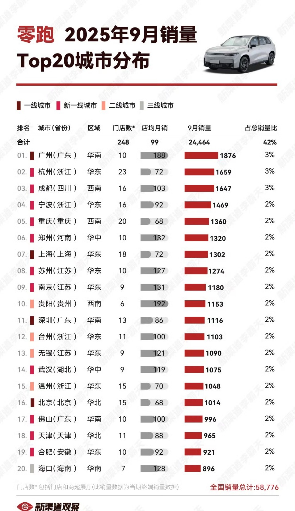 【零跑25年9月销量TOP20城市】TOP20城中有16城销量破千广州超越总部杭