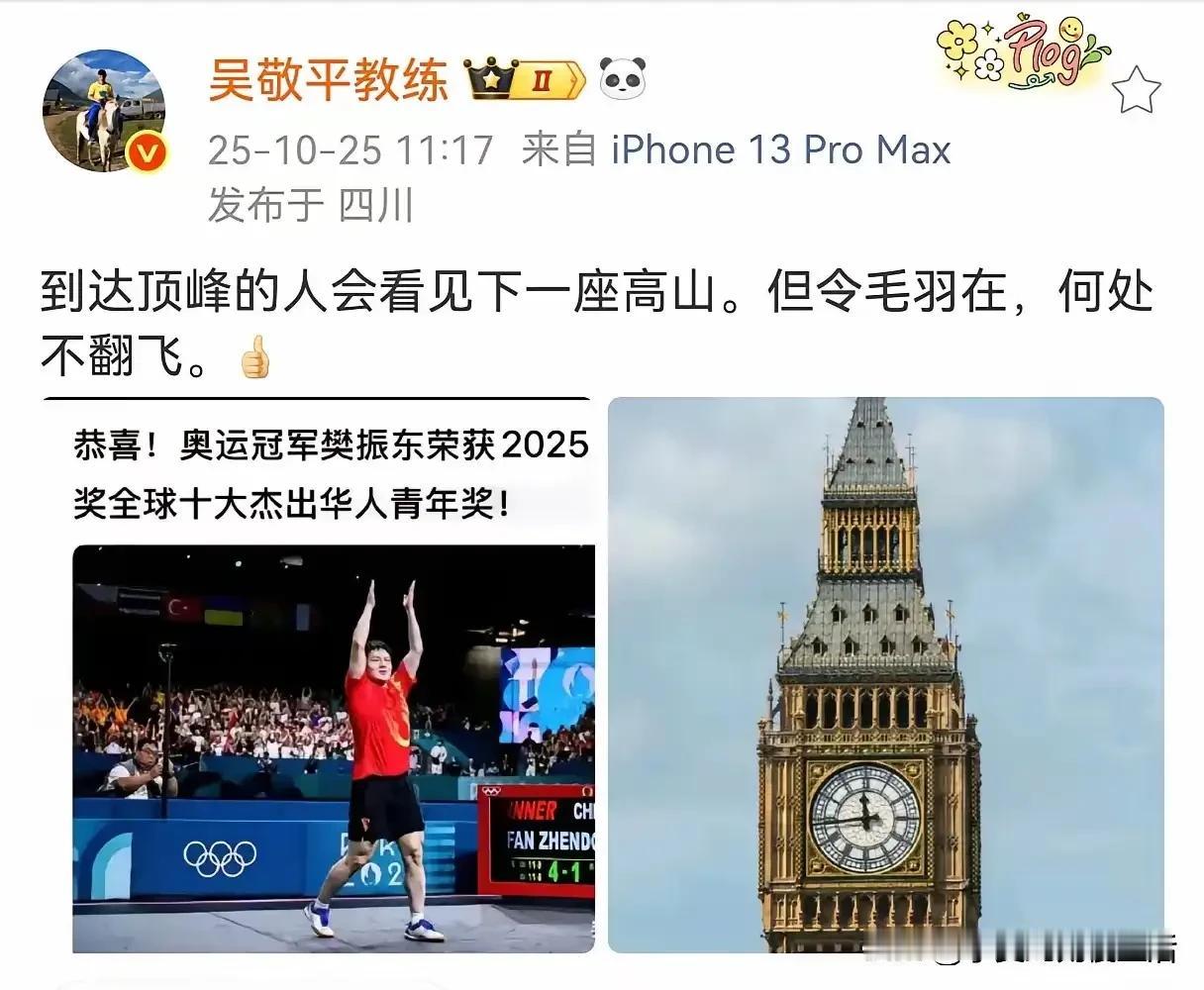 吴敬平是真护犊子!樊振东得了大本钟奖。他又发文了说到达顶峰的人会看见下一座高山。更重要的是他还用了一首古诗:但令毛羽在,何处不翻飞! 真没看出来,吴敬平还真的是国乒队少有的有深厚文化底蕴的老教练哈!他是真的偏爱樊振东这个徒弟,那么多得意门生里,他就给樊振东一篇又一篇的写微博。