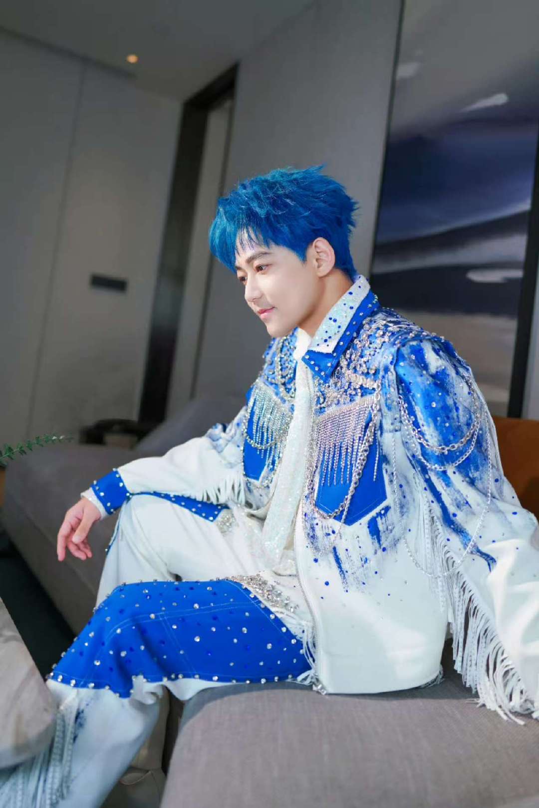 苏醒为0713演唱会染了蓝发被苏醒的蓝发惊到了!这蓝色头发很有个性,他穿着闪亮的