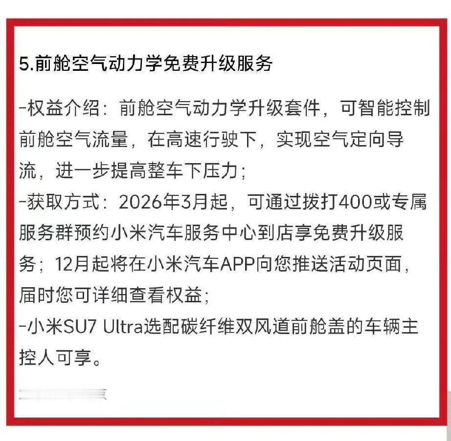 时隔几个月,小米SU7ultra车主终于可以使用上真正的碳纤维双风道前舱盖! 此前选装这个价值42,000元的车主发现里面并没有相关的风道结构,此次小米推出了空气动力学免费升级服务,在明年3月份就可以预约进行升级了。 此前的碳纤维双风道前舱盖只是一个装饰件,并不具备提供额外空气下压力的能力,此次升级就是为了弥补此前产品的不足之处。 让小米SU7ultra的选装件真正具有提供额外下压力的条件,这对于选装了42,000元的车主来说是不亏的。