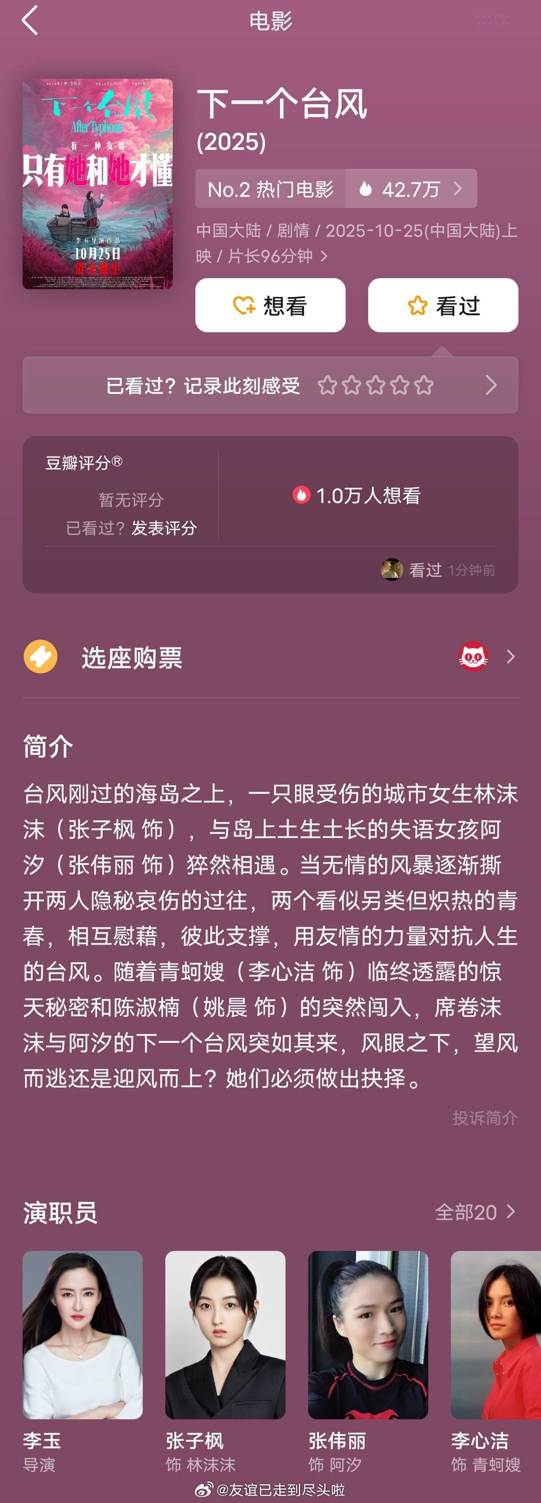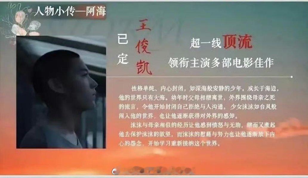 台风导演李玉,监制方励和王俊凯合作过断桥,最初的备案和人物小传,剧情都围绕着少年阿海和少女林沫沫,台风前期招商海报还写着王俊凯已定,后面阿海这个角色变成女生,由张伟丽饰演,内核依然是互相救赎。