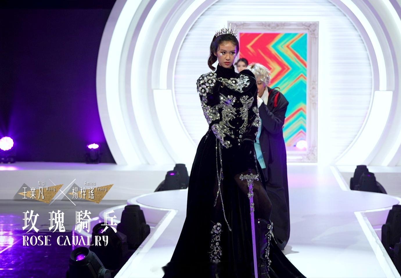 王业凡Nigi为打造"女骑士Amina",结合玫瑰花concept,用大量珍珠、钻石缝在黑色麂皮上;再加上Amina的霸气演绎,绝对天衣无缝。全场唯一男模特儿何广沛的设计师林华源Kay,则采用了数码印花定位技术、错位效果,配以手绘皮鞋及手袋,为广沛设计新造型,而且Kay更以神来之笔,为自己打造一套与广沛相衬的战衣,实行以"情侣装"上阵,话题度十足。