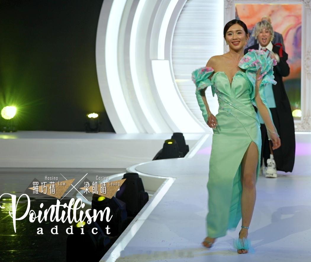 两位主持的晚装亦别具心思,冯盈盈的服装由《剪裁魔法师》冠军得主姚子裕Kev Yiu设计,若隐若现的透视效果呈现盈盈美好身段,高贵中见性感;而森美的服装则由《剪裁魔法师》季军得主王竣鋐Jackson Wong设计。
