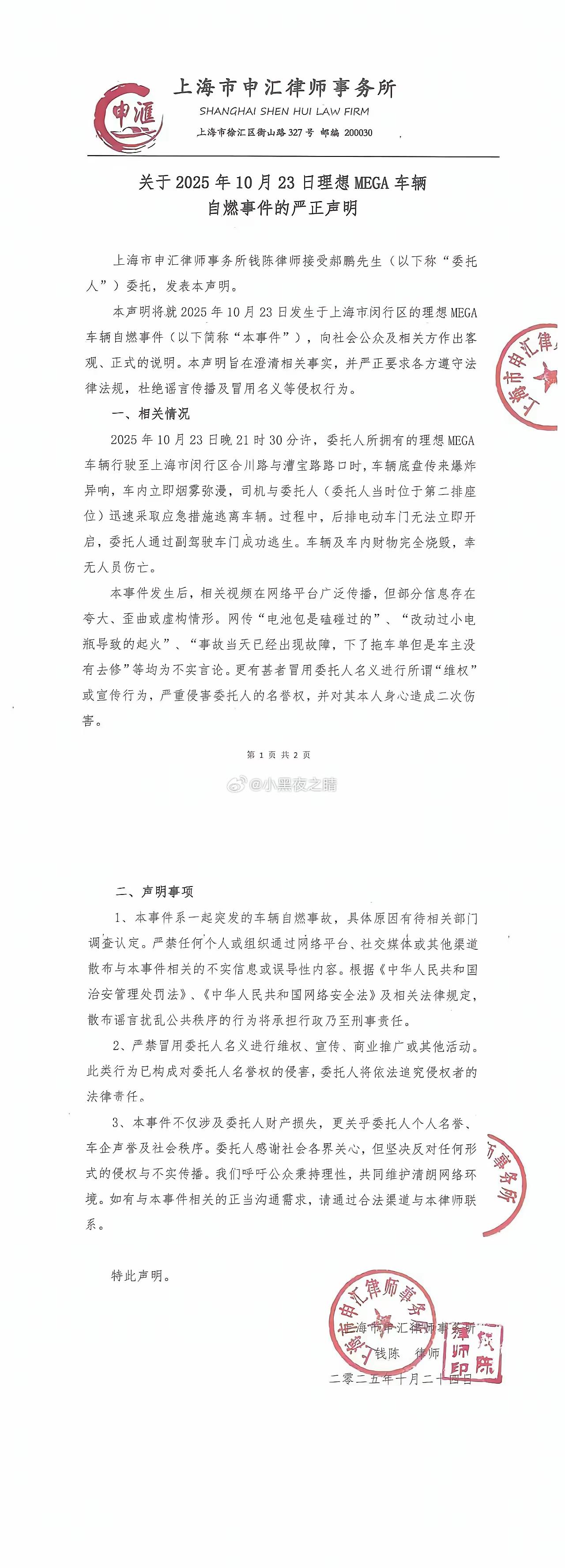 理想mega行驶中自燃,车主不像其他新能源车主,在网上发视频,这位上海的车主直接让自己的律师发布一条严正声明,不会像其他车主一样,发个视频要么被和谐,要么账号没了。