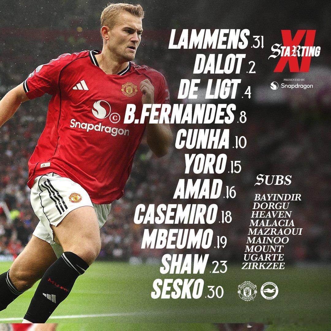 曼联首发:31-拉门斯、23-卢克·肖、4-德里赫特、15-约罗、2-达洛特、18-卡塞米罗、8-B费、16-阿玛德、10-库尼亚、19-姆伯莫、30-舍什科