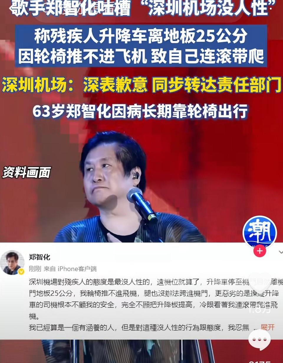63岁歌手郑智化吐槽“深圳机场没人性,冷眼旁观,因轮椅推不进飞机,致自己连滚带爬。深圳机场: 深表歉意同步转达责任部。 网友表示: 那个冷眼旁观的升降机司机必须开除,不知道他以这样的态度看了多少残障人士的笑话了。他没想到这次郑智化会把他点出来,不开除他服不了众。 我觉得说没人性已经很斯文了,如果你是同乘旅客,冷眼旁观不搭把手也是没人性。 那个升降车司机肯定已经后悔了,本来以为戏弄的只是个普通人,谁知道碰上了有话语权的。 现在全国网民最关注的问题:操纵升降车的司机,态度如此恶劣,深圳机场到底辞退不辞退? 对老弱病残的的服务态度,才能体现文明程度! 这是作为人的基本素养,与是否一线城市、是否大公司无关。我相信,在内地二线城市机场的工作人员,能这样冷漠冷血的不多。这体现了这个城市、这个公司的文化属性!